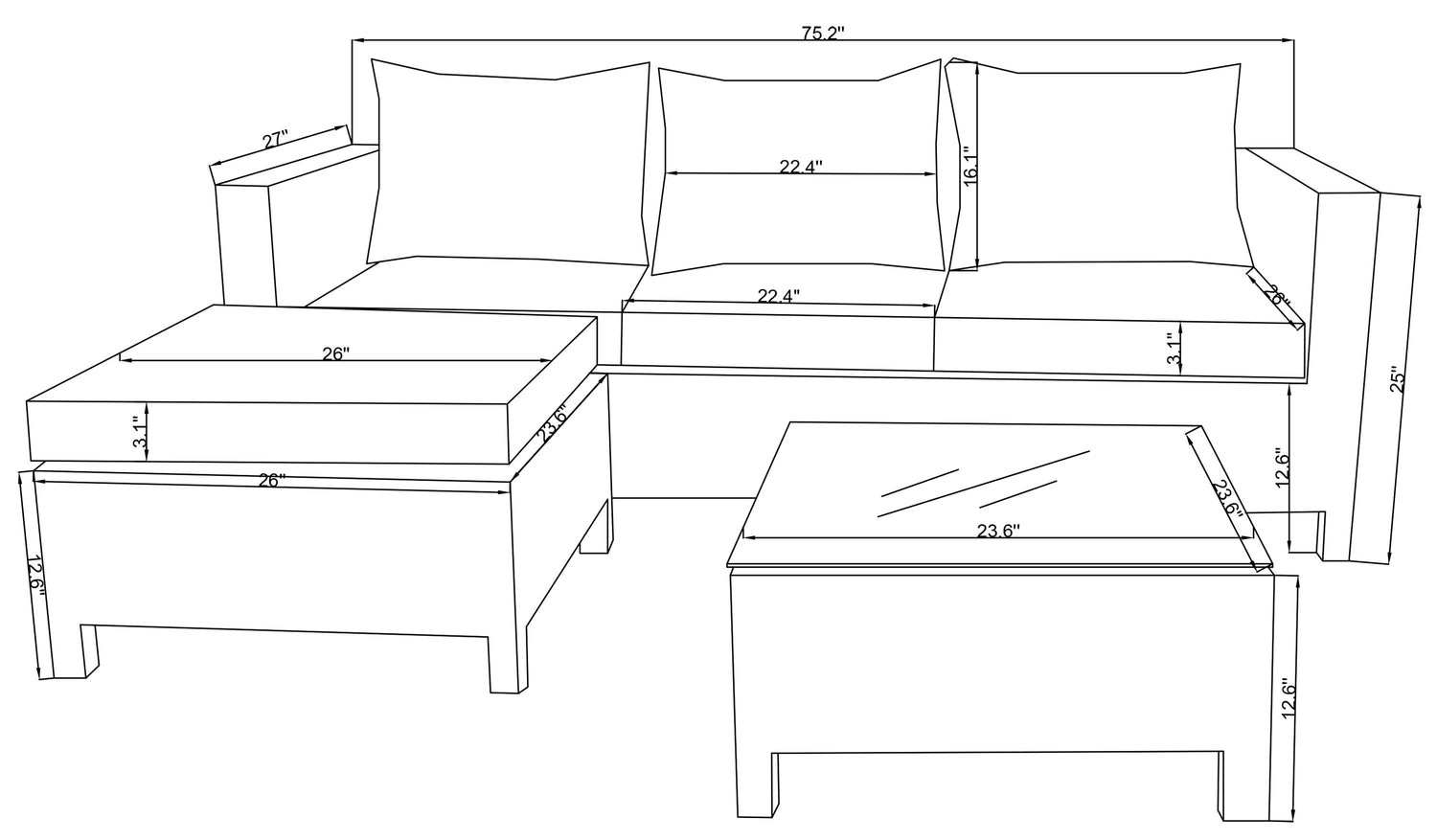 Width: 68.1" (173.0 cm) Height: 14.2" (36.1 cm) Depth: 26.8" (68.1 cm)