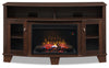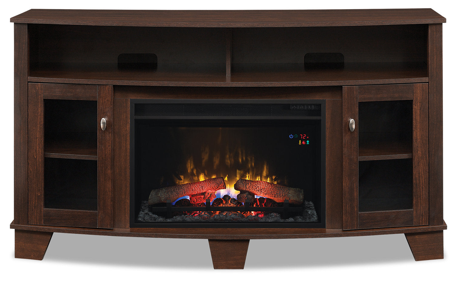 Establish a space of convenience and comfort with this handsome Micah electric fireplace TV stand. Finished in a two-tone woodgrain veneer, this piece presents a traditional and stately character. A large partitioned shelf provides space for media consoles while two cabinets provide a place to tuck away books, batteries and other household essentials. The 4,600 BTU firebox can heat up to 400 square feet, perfect for small spaces, or you can simply set the mood by selecting from several flame effect options with or without heat. Kick back in cozy warmth with this classic Micah TV stand.