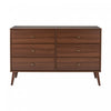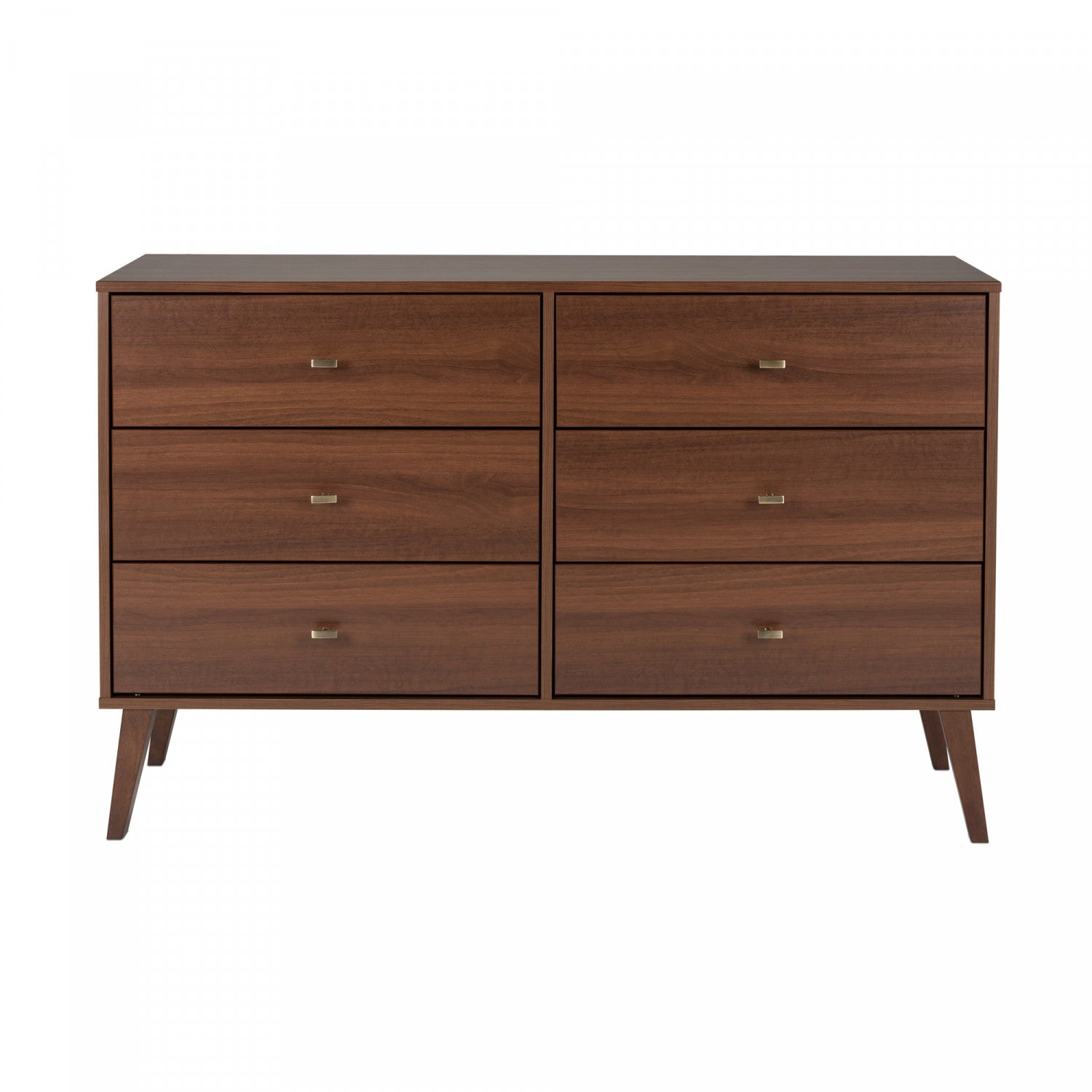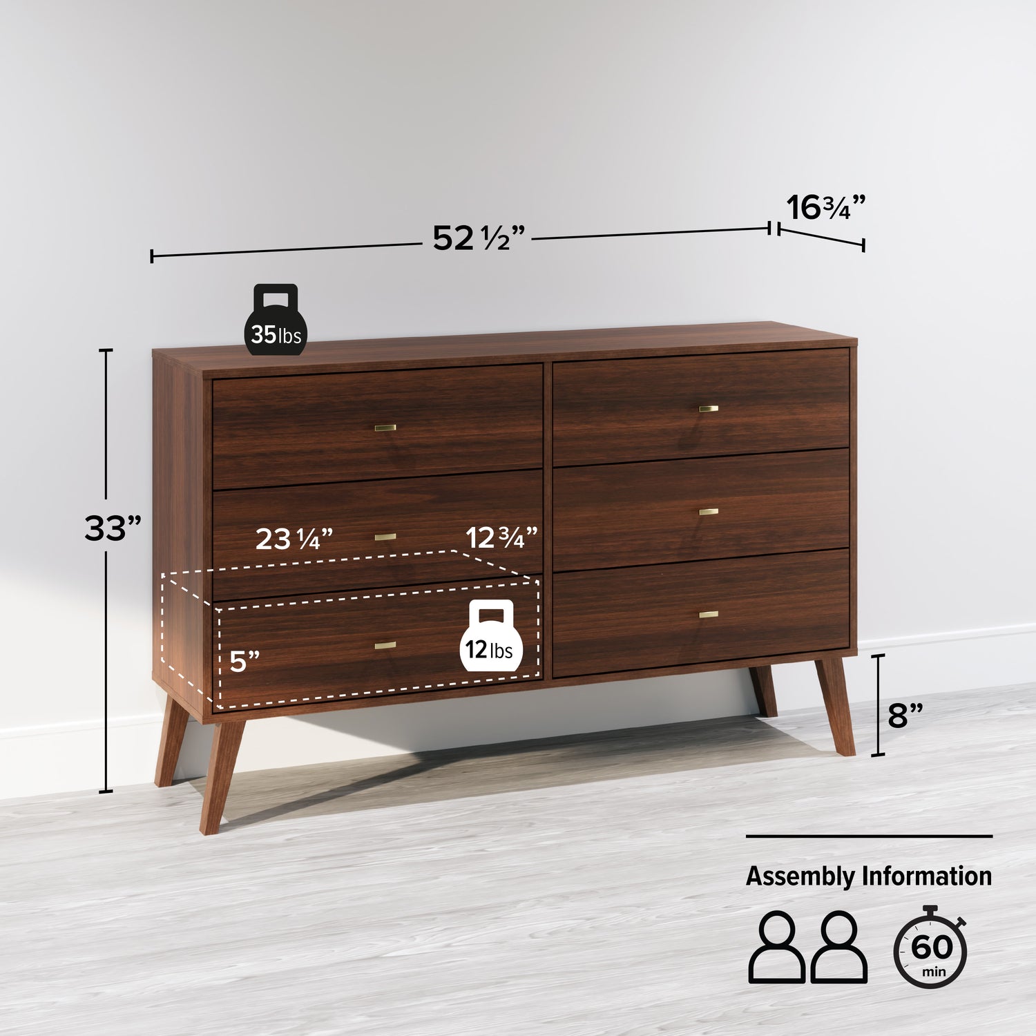 The Prepac Milo 6 drawer dresser is a modern take on a retro look, with a sleek mid-century modern design that adds a touch of vintage styling to your bedroom. Six drawers run smoothly on metal glides, offering easy access to storage for clothing and bedroom items. The tapered solid wood legs and inset drawers deliver a clean and modern look to your bedroom. Brushed brass finished knobs add to the retro-chic design of this functional and fashionable dresser. Style this dresser on its own, or combine it with any of the products in the Milo collection for a timeless look.