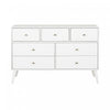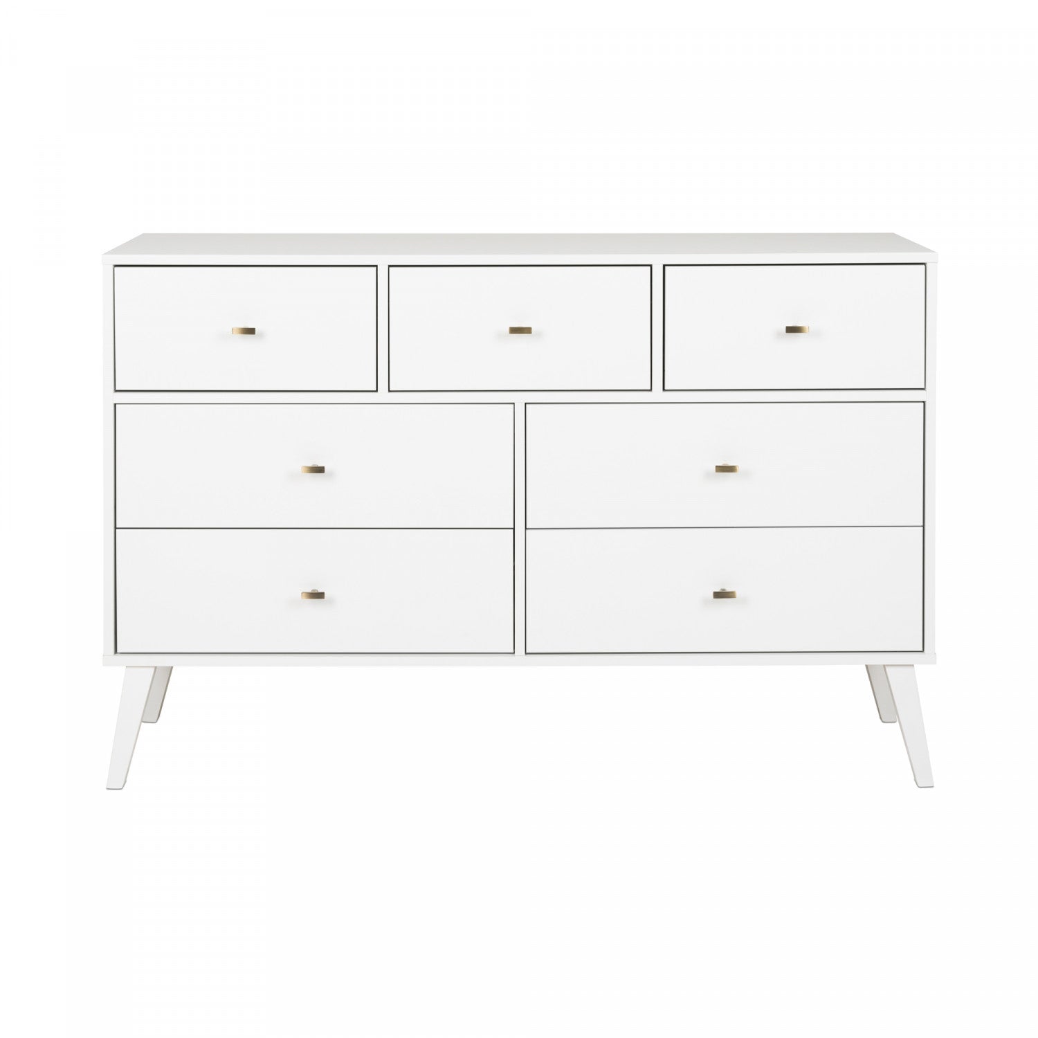 The Prepac Milo 7 drawer dresser is a modern take on a retro look, with a sleek mid-century modern design that adds a touch of vintage to your bedroom. Three small drawers on the top row are well suited for personal clothing, while the 4 large lower drawers have ample room for sweaters and larger items. All seven drawers run smoothly on metal glides, offering easy access to storage for clothing and bedroom items. The tapered solid wood legs and inset drawers deliver a clean and modern look to your bedroom. Brushed brass finished knobs add to the retro-chic design for a functional and fashionable dresser. Style this dresser on its own, or combine it with any of the products in the Milo collection for a timeless look.