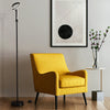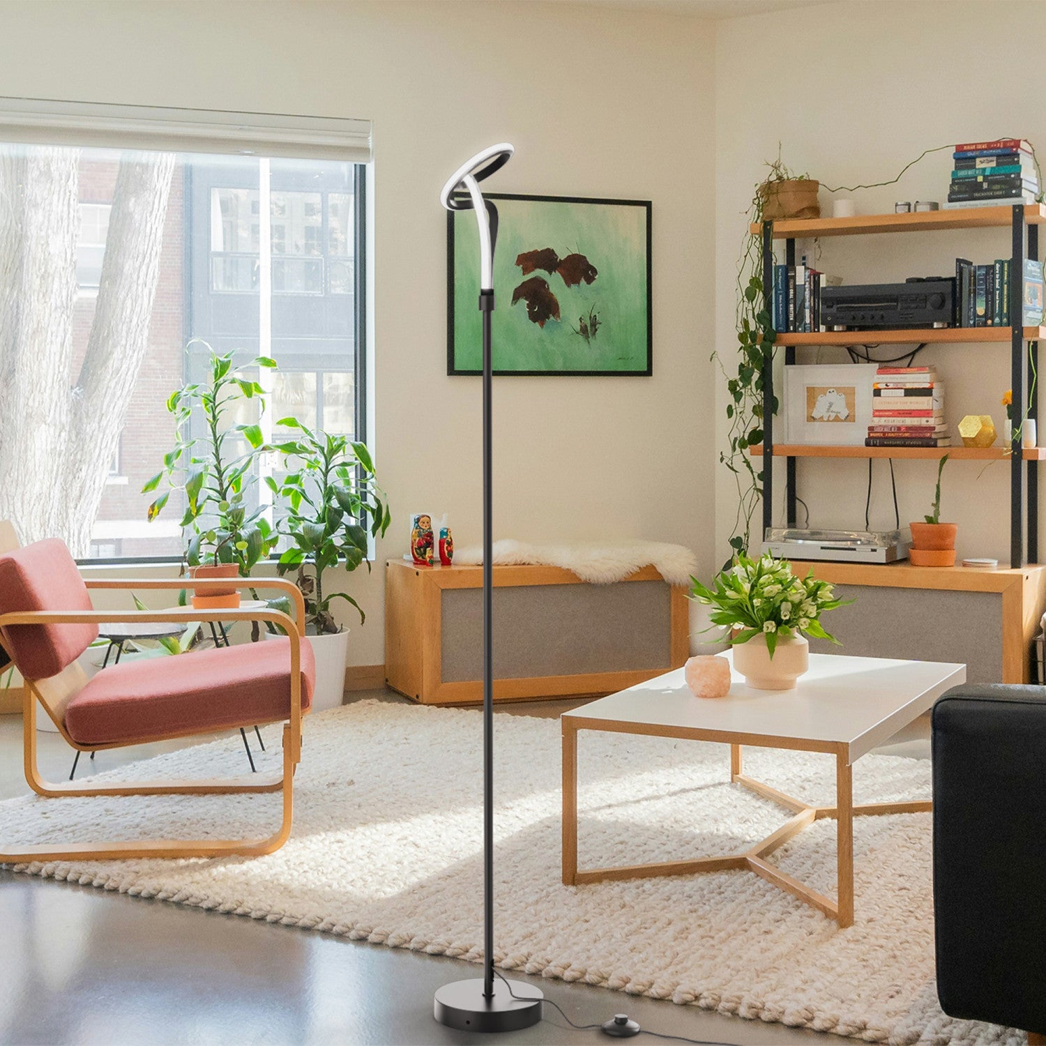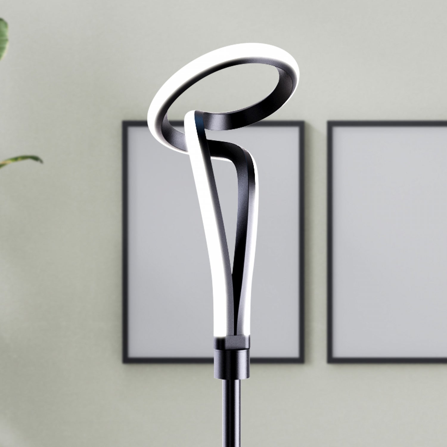 This 59-inch floor lamp combines sleek design with functional lighting. The looped led element at the top provides a soft white 3000k light, ideal for creating a warm and inviting atmosphere. Its striking matte black stand and rose gold accents offer a contemporary look, perfect for any stylish interior. The lamp’s slender form factor is not only space-saving but also an exquisite addition to your decor.
