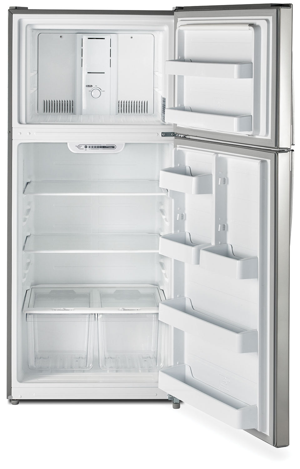Give your groceries a happy home inside this 18-cubic-foot refrigerator from GE. Behind the stainless steel doors is a well-lit and climate controlled chamber where food stays fresh until you're ready for a satisfying snack. Two full-width glass shelves within the fridge help keep things bright while making it harder to lose items in dark corners. And finally, the humidity-controlled drawers keep your celery from quickly going floppy and your meats from souring too soon.
