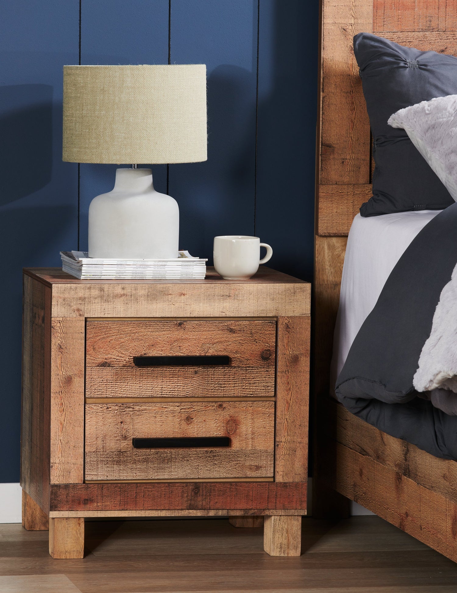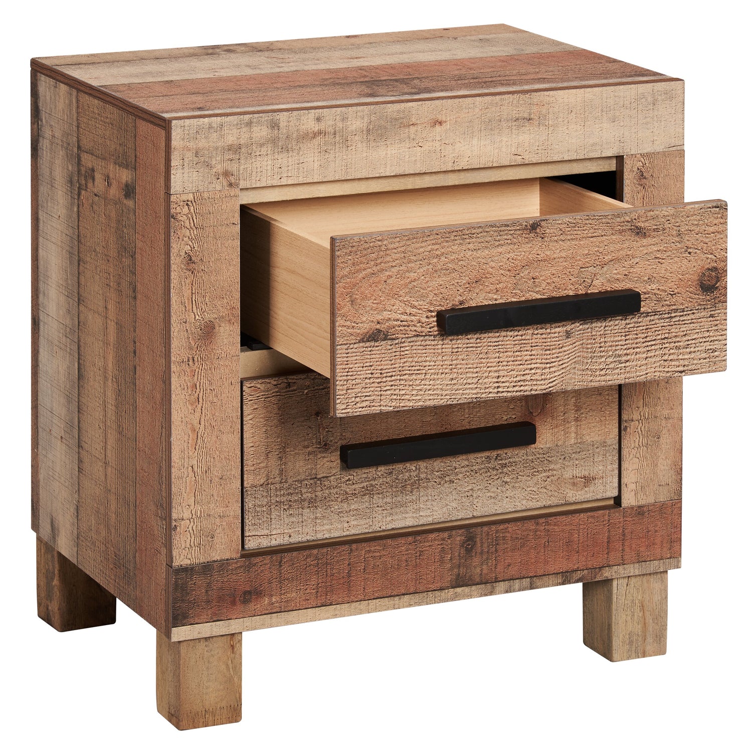 Add a breath of fresh air to your bedroom with the Mojave nightstand. Two deep drawers with sturdy metal drawer pulls are ready to hold your clothing, blankets or other bedroom essentials. Reclaimed wood-styled planks are finished in both light and dark shades of brown to add a stylishly weathered touch. Add the Mojave to your bedroom and let its rustic style help you create your own personal bedroom oasis.