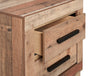 | Hardware | Rectangular black metal drawer pulls decorate the front of the pieces. |
