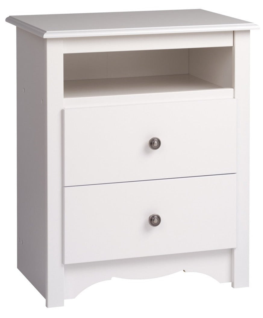 Not all furniture storage is created equal, and the Monterey Tall 2 Drawer Nightstand with Open Shelf offers proof. Not stopping at two full-sized drawers, both primed for storing all your sundries, this bedside table also offers you an open shelf for those items you don't want totally hidden away. With its scalloped base panel and demure elegance, your bedroom will gain both storage space and a touch of elegant sophistication. Liven up your bedroom's decor by coordinating it with other members of the Monterey Bedroom Collection!