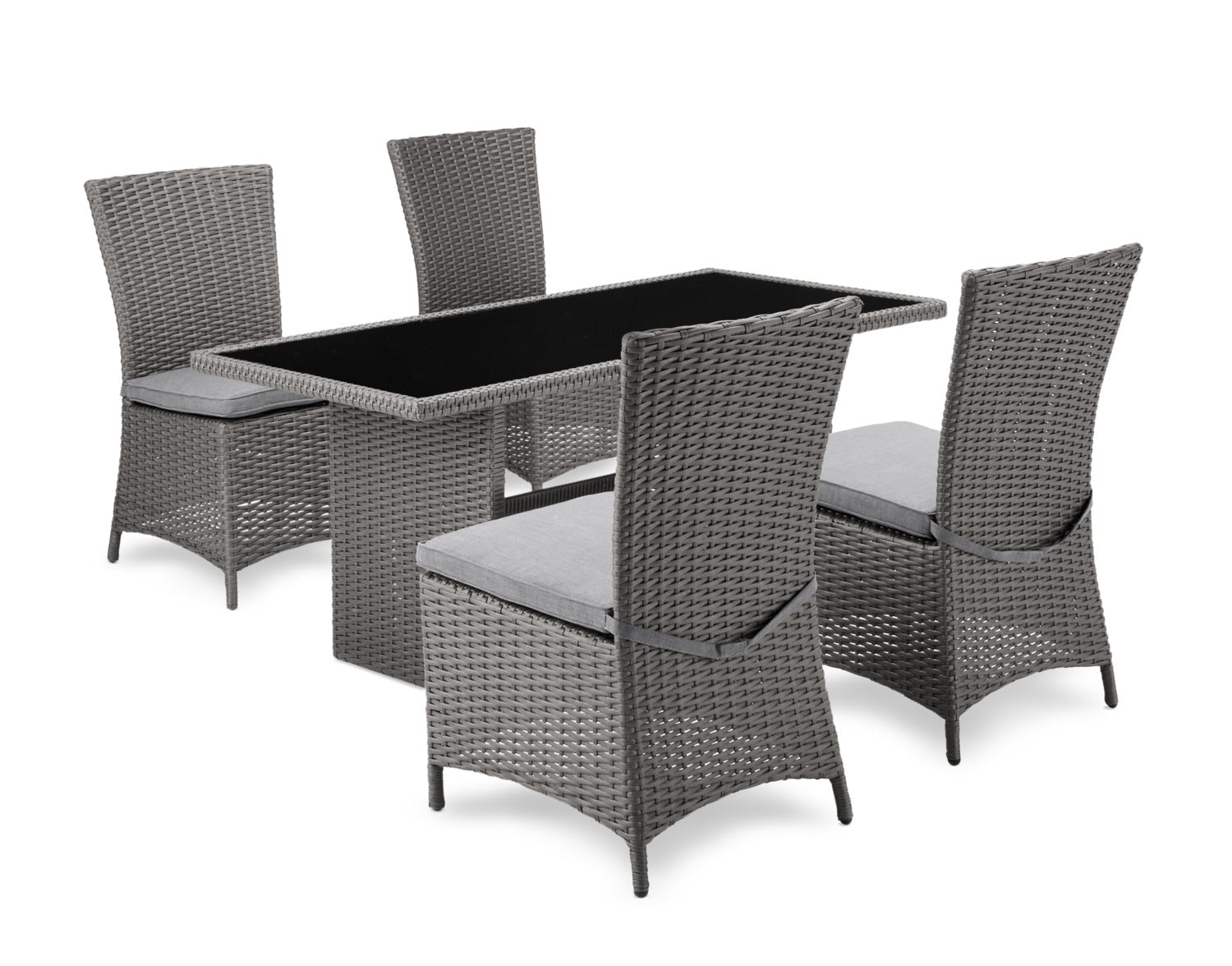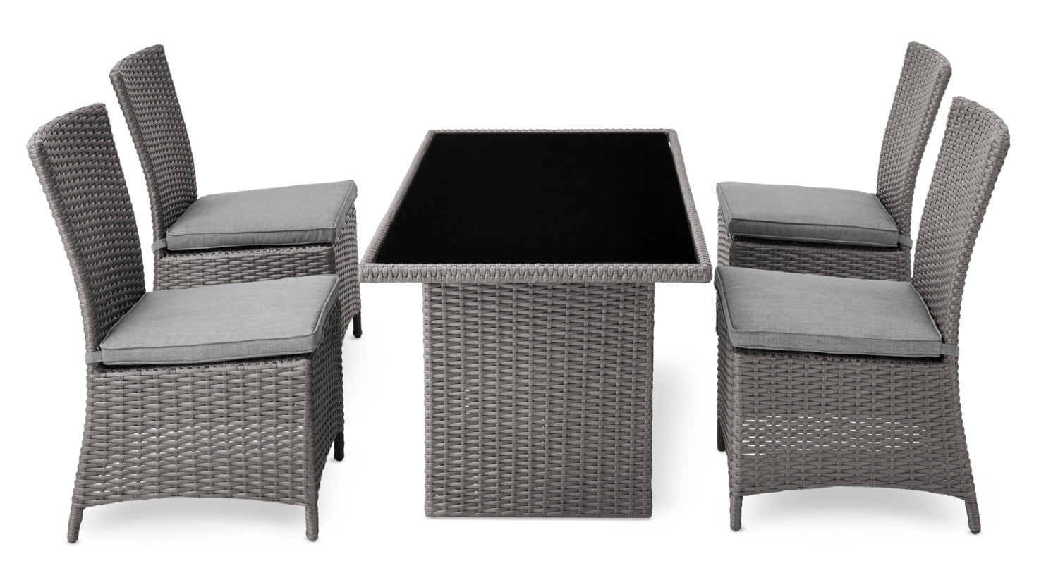 Summer means cool iced teas and hot BBQ, and with the Morris five-piece patio dining package you'll have front row seats to the seasonal feast. The table's solid steel frame is wrapped in resin wicker and topped in black tempered glass for a piece that's both ready to take what you can dish up and easy to clean afterwards. Plush grey olefin cushions offer comfortable, foam-stuffed seats you’ll want to relax on for hours. Tall chair backs give you space to lean back and relax as you digest. Settle into the Morris for your next big outdoor event and make the most of summertime fun.