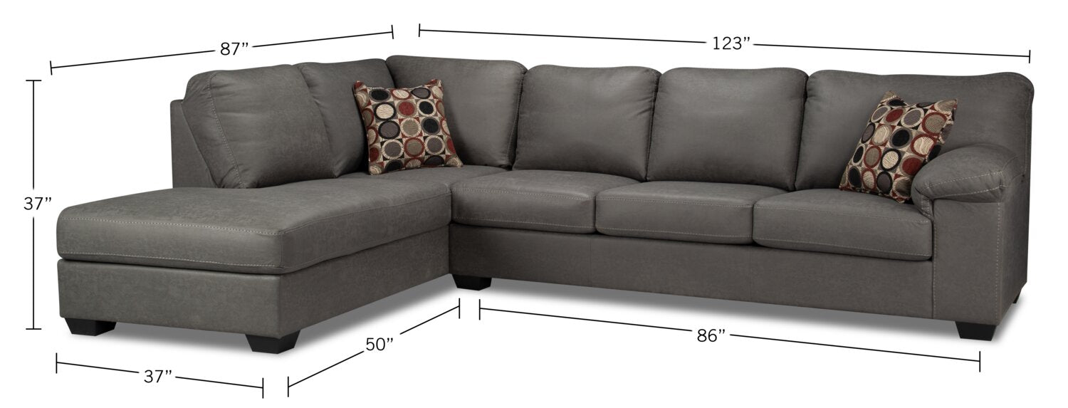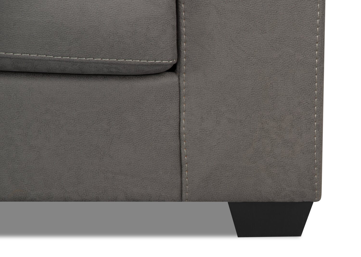 Plush and inviting, this lovely leather-look Morty sectional will bring a casually chic feel to your space. Made to look like genuine leather, the breathable grey fabric covering this piece will leave you feeling neither too hot nor too cold when you take a seat. Plump layers of high-density foam are wrapped with Dacron® fabric and stuffed inside the cushions to keep you feeling relaxed all year round. Finally, the Morty sectional's angled backrests and tapered feet give your home a contemporary appeal you'll love to share with friends and family.