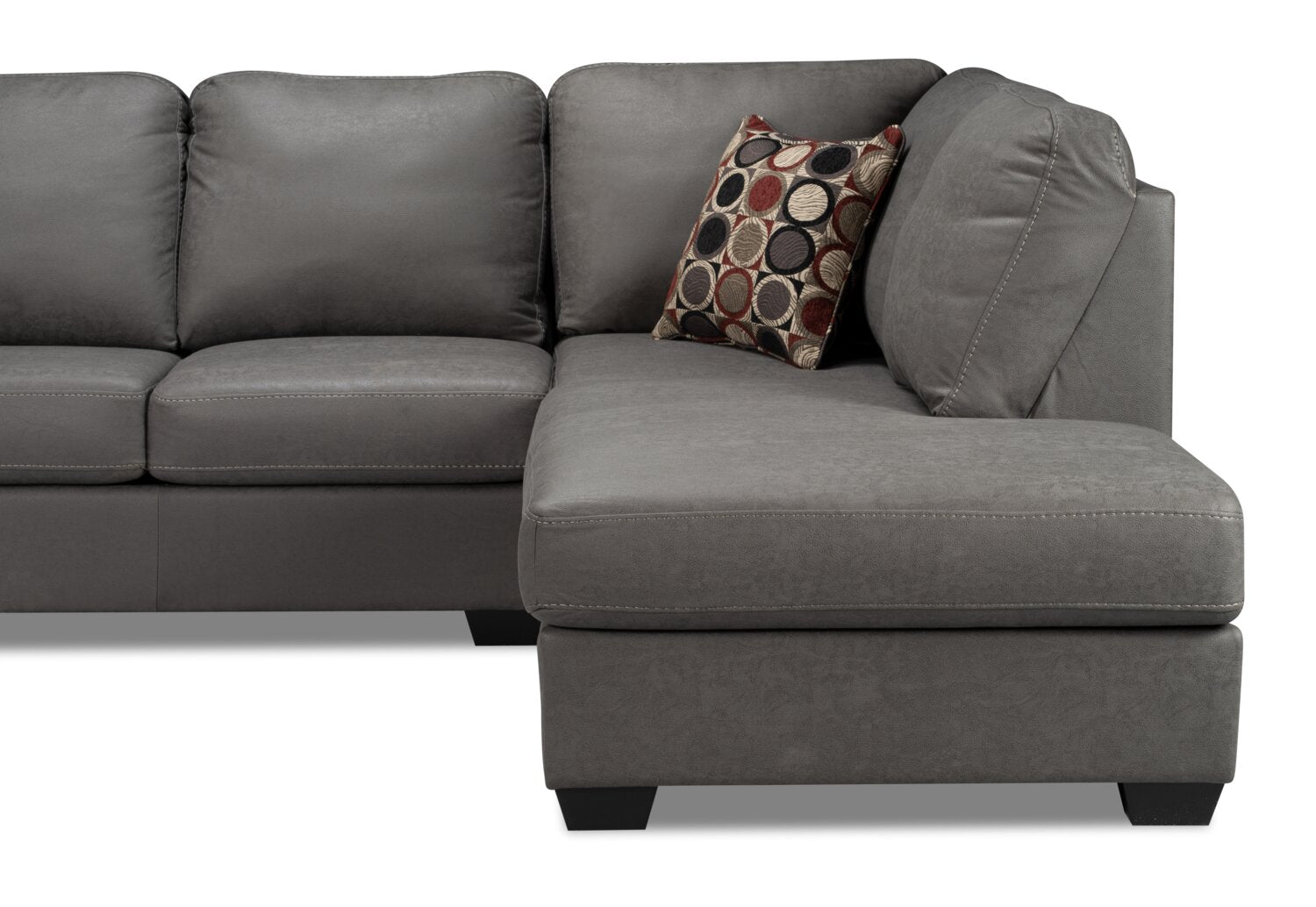 Plush and inviting, this lovely leather-look Morty sectional will bring a casually chic feel to your space. Made to look like genuine leather, the breathable grey fabric covering this piece will leave you feeling neither too hot nor too cold when you take a seat. Plump layers of high-density foam are wrapped with Dacron® fabric and stuffed inside the cushions to keep you feeling relaxed all year round. Finally, the Morty sectional's angled backrests and tapered feet give your home a contemporary appeal you'll love to share with friends and family.
