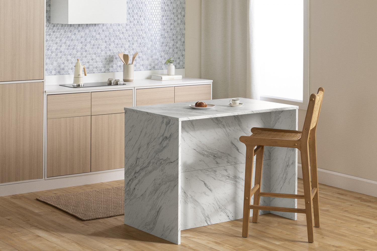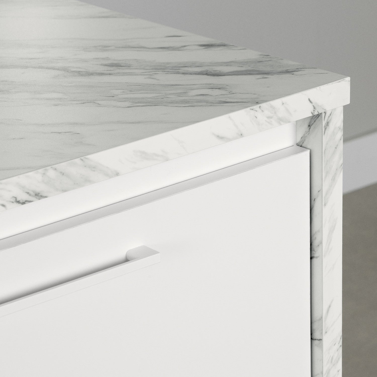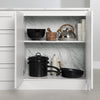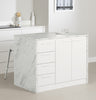 A kitchen island that’s perfect for small spaces. If you’re short on space when cooking meals in your kitchen, this island will become your best friend! Whether you live in a house, a small apartment, or a condo, the smaller size means it can easily fit in the center or against your kitchen wall... And you can use the large surface to prepare your favorite recipes. Add two stools at the open space, and you can sit comfortably to eat breakfast or have drinks with friends. No doubt about it: this counter will become the focal point of your room! A quality work space with plenty of storage. A functional kitchen is what everyone dreams of. This island has 4 drawers on metal slides that are great for storing and organizing your utensils, spices, tablecloths, and small cooking tools. Behind the two doors is an adjustable shelf that can be set at any one of 4 different heights, so you can adapt your storage to your needs. You can store food, pans, or even small appliances, and you’ll have a neat, organized kitchen that’ll make your life easier! A quality contemporary design. Brighten up your kitchen decor with this trendy, sophisticated contemporary counter. Its slim metal handles and sturdy surface will add a clean, distinguished touch to your room. Another plus: the surface and sides of this piece are made of melamine, so they’re water and scratch resistant.