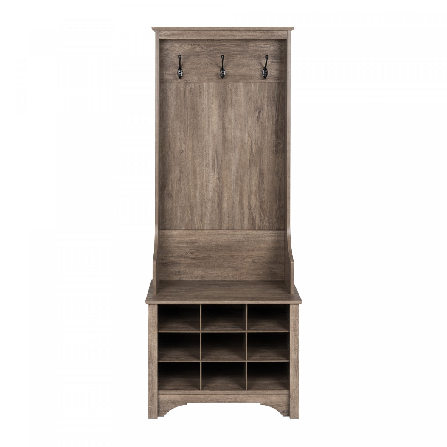 Get organized with the Prepac Narrow Hall tree. The stylish and minimalist design allows the hall tree to fit in compact spaces, while still providing plenty of space for your all your entryway belongings. Place your jackets, hats, purses and scarves on the 3 strong double coat hooks, and store your shoes in the 9 convenient shoe cubbies, which double as a bench. The space saving design will add essential storage to your home.