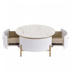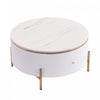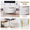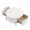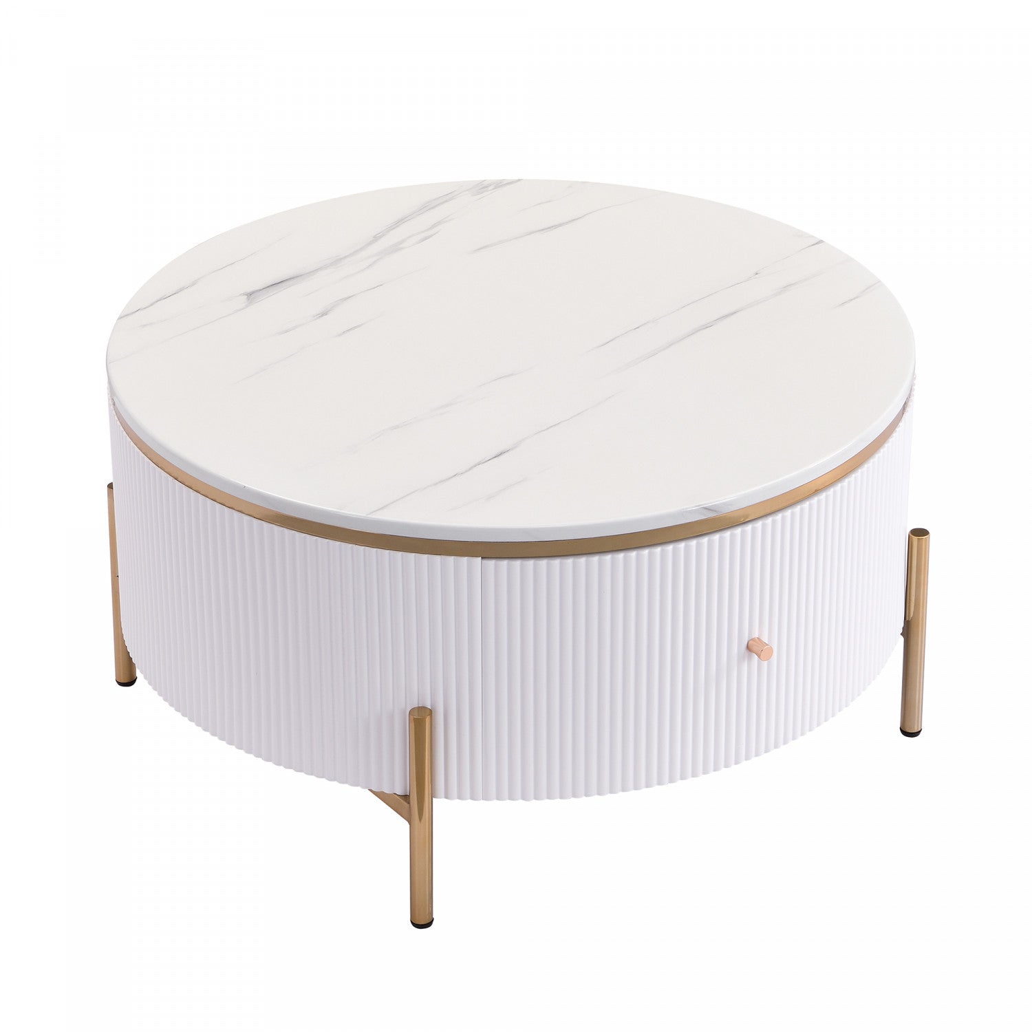 Bring bold elegance to your space with the modern round coffee table, featuring a marble-patterned engineered wood top, golden legs, and two large drawers for practical storage. Its round silhouette perfect for organizing living room essentials like remotes and books, this table combines luxurious design with everyday function. Sturdy engineered wood construction ensures lasting use, while the spacious surface makes it ideal for decor, drinks, or display. Stylish and smart—this accent table is a modern must-have.