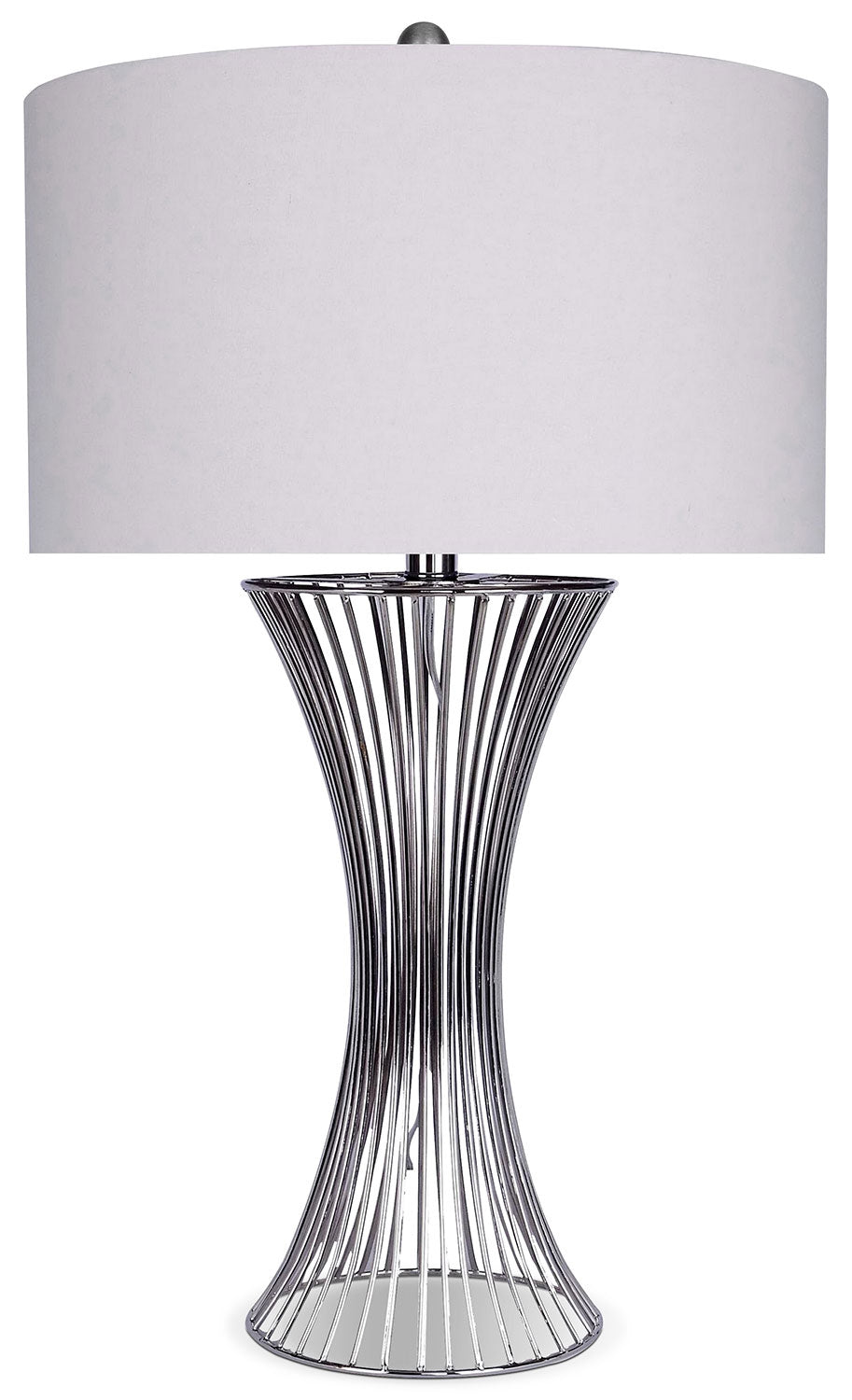 Classic, hourglass curves come together with modern, contemporary lines in this timeless nickel cage table lamp. Transitional style defines this piece, which brings a striking sheen into your space with its nickel wire cage. Plus, simple sophistication tops the lamp’s base thanks to its fresh, white linen drum shade.