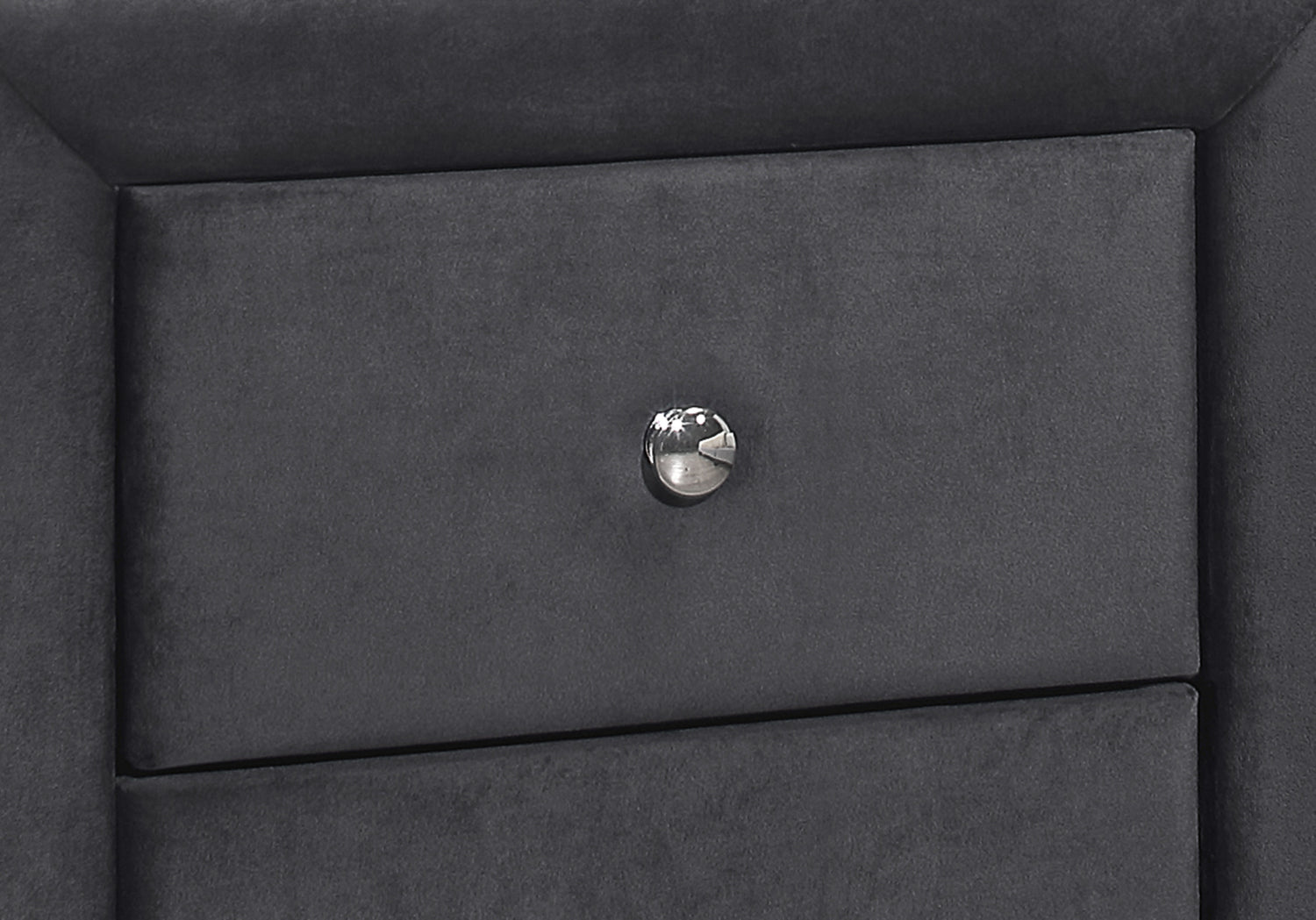 This upholstered nightstand demonstrates how minimalism can be both chic and sophisticated. The timeless and contemporary design emphasizes clean, rectangular lines and smooth surfaces. This bedroom accent features a foam-padded plywood frame, upholstered in dark grey velvet-look fabric. The chrome-finished metal drawer knobs provide a contrast to this upholstered side table as an additional style element. This nightstand also features two storage drawers, giving you more places to store items at your bedside. This collection includes a matching bed (available in either Queen, Twin or Full size) which is sold separately.