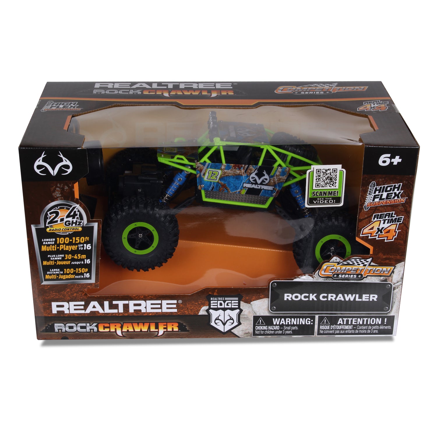 Get your climb on with Realtree 1:16 scale, radio controlled, full function Rock Crawler! Its superior level of performance & innovative suspension system allows for unparalleled rock crawling adventures. Driven by an incredibly powerful motor and insanely grippy tires, the ratio of chassis to super rugged body make this rock crawler ready to tackle even the toughest climbs! Features include: 2.4 GHz frequency that allows 16 players to race at the same time with a range of up to 150 feet. Pistol Grip Controller for full function capabilities, Real Time 4x4 & High Flex Suspension.