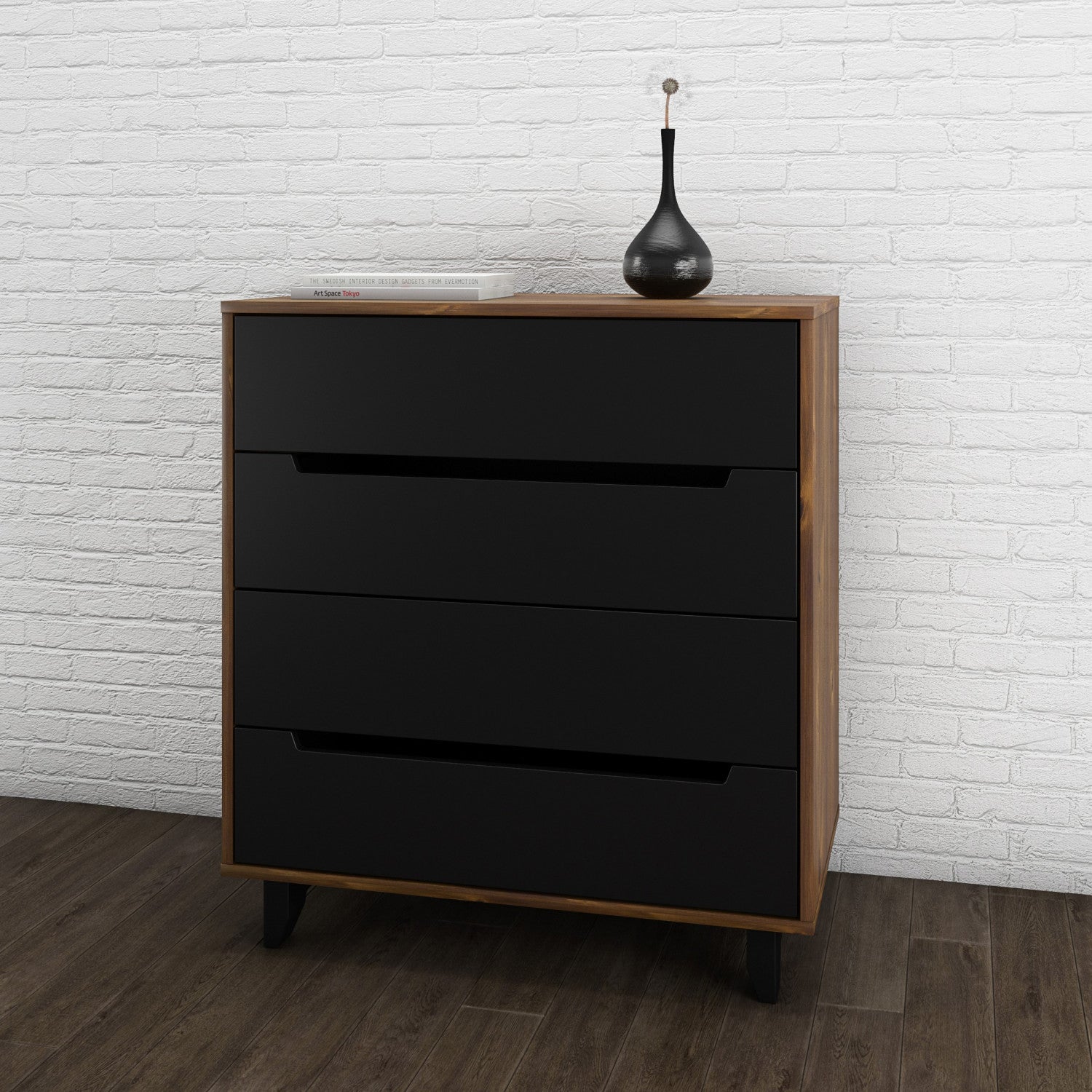 This 4-drawer chest is offered in Truffle with carved matte black drawer fronts and legs. The modern lines are softened by the cut-out handles that add style to any decor. It offers a stylish solution to store your clothes and personal belongings.