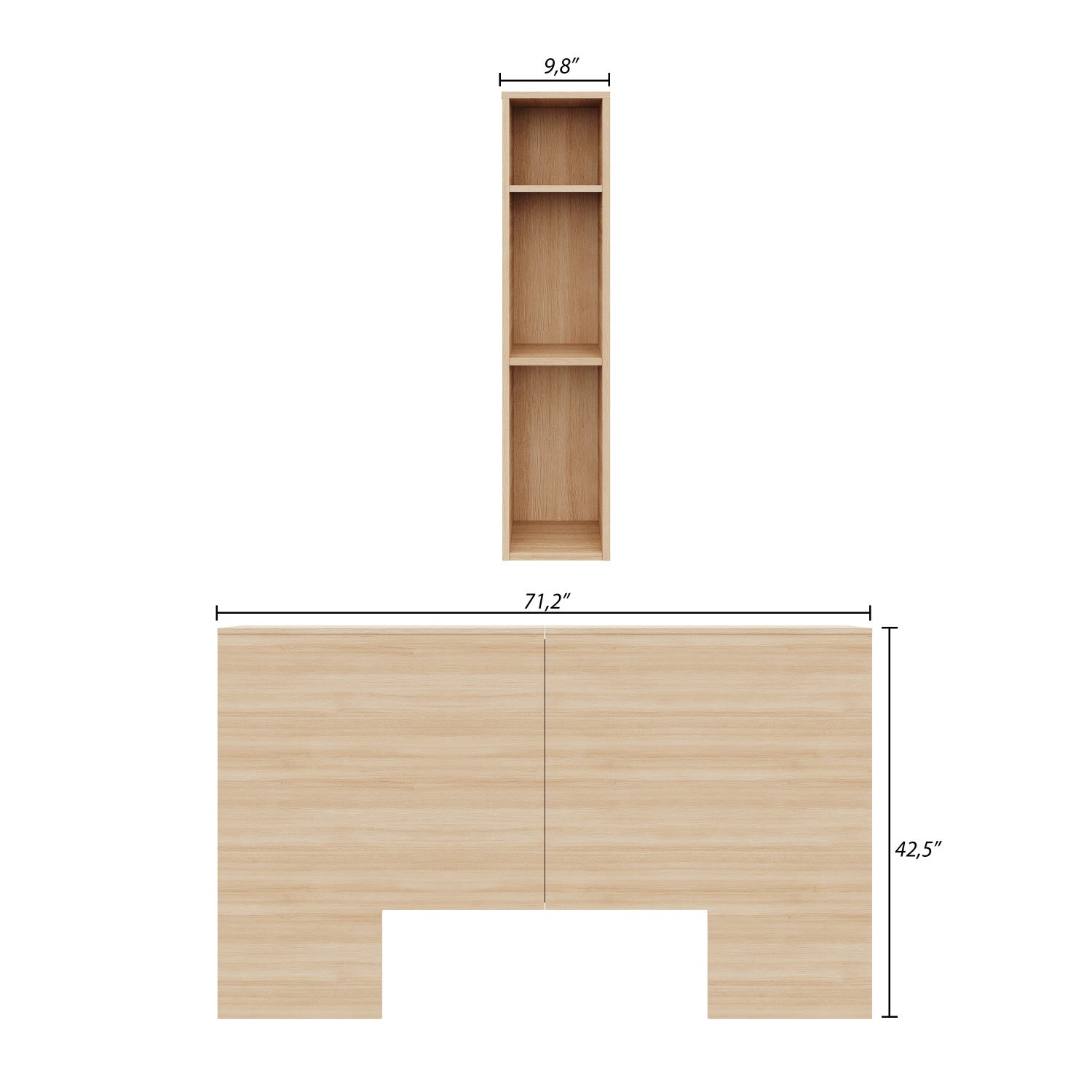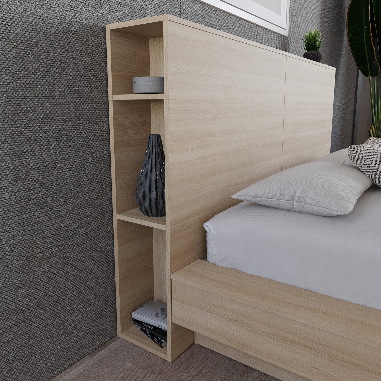 Effortlessly elevate your space with our Modern Headboard – a stylish and functional centerpiece that seamlessly blends contemporary design with practical functionality. This clever headboard boasts the perfect combination of clean lines and a minimalist aesthetic, adding a touch of sophistication to your bedroom decor. Crafted from high-quality engineered wood, our headboard showcases the natural grain color variation, bringing an organic touch to your space. Enjoy the added convenience of three shelves on each side, perfect for books or storage. Plus, with a one-year warranty, you can trust in the durability and quality of your new Natural Oak headboard.