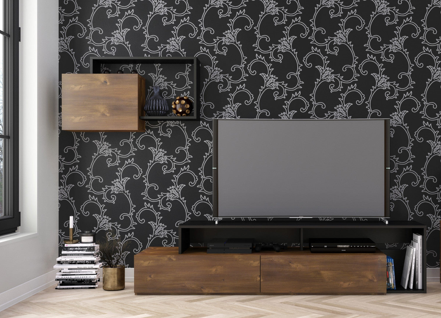 This Paisley 72-inch TV stand was created with a modern touch in mind with its clean lines and contrasting volumes. This TV stand features 2 convenient storage drawers and open space compartments for decorative pieces, all in a rich black and Truffle finish. The Paisley entertainment collection from Nexera is distinguished by its clean modern lines, high-end designer look and contrasting volumes.