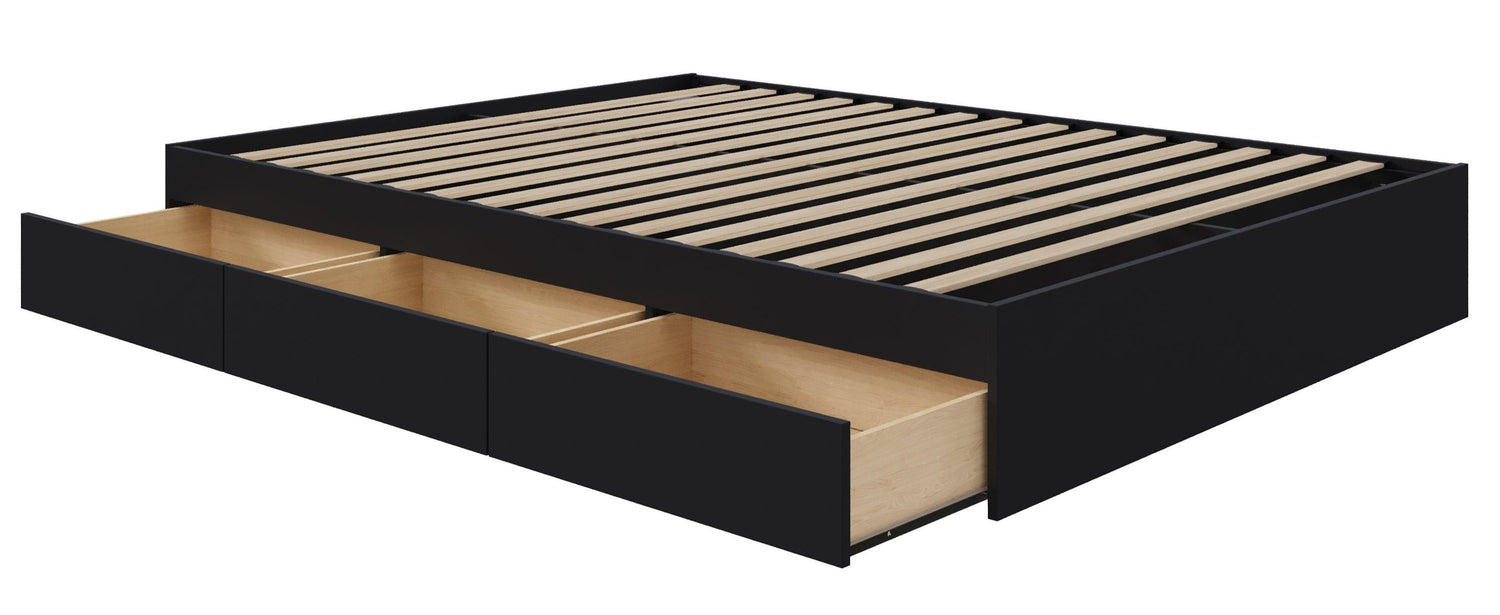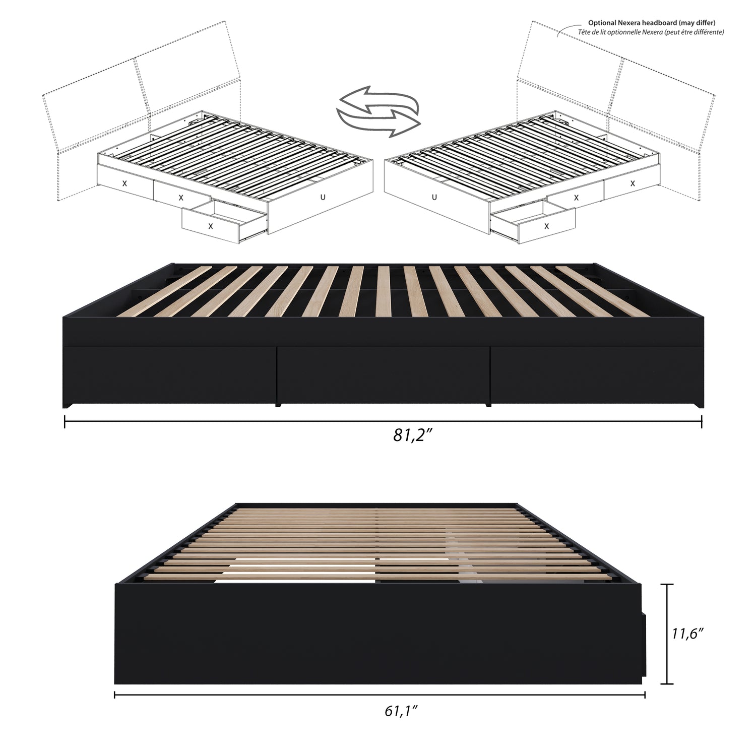 Nexera Queen size 3-drawer bed in Black can be paired with different Nexera Queen size headboards to create a complete bed set with lots of storage. This Queen Size 3-Drawer Storage bed offers 3 convenient drawers, ideal to store away beddings, clothes, toys, books without taking any extra square footage. It's also entirely reversible, so you can decide on which side of the bed you prefer having the 3 drawers. This bed frame features a unique metal and hardwood slat construction allowing for easy assembly, sturdy construction and easier handling.