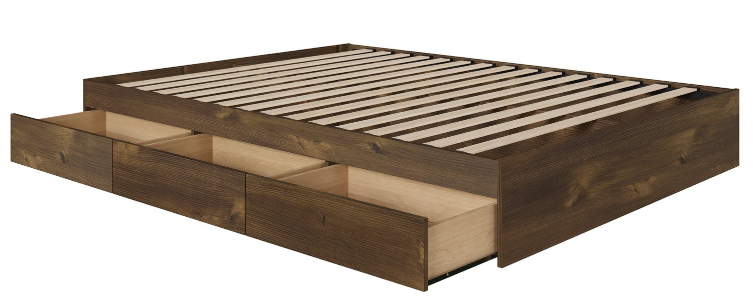 Nexera Queen size 3-drawer bed in Truffle can be paired with different Nexera Queen size headboards to create a complete bed set with lots of storage. This Queen Size 3-Drawer Storage bed offers 3 convenient drawers, ideal to store away beddings, clothes, toys, books without taking any extra square footage. It's also entirely reversible, so you can decide on which side of the bed you prefer having the 3 drawers. This bed frame features a unique metal and hardwood slat construction allowing for easy assembly, sturdy construction and easier handling.