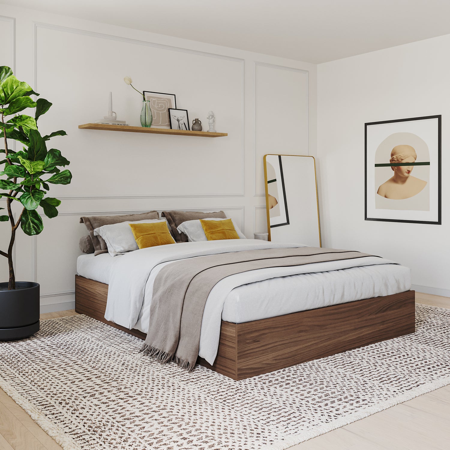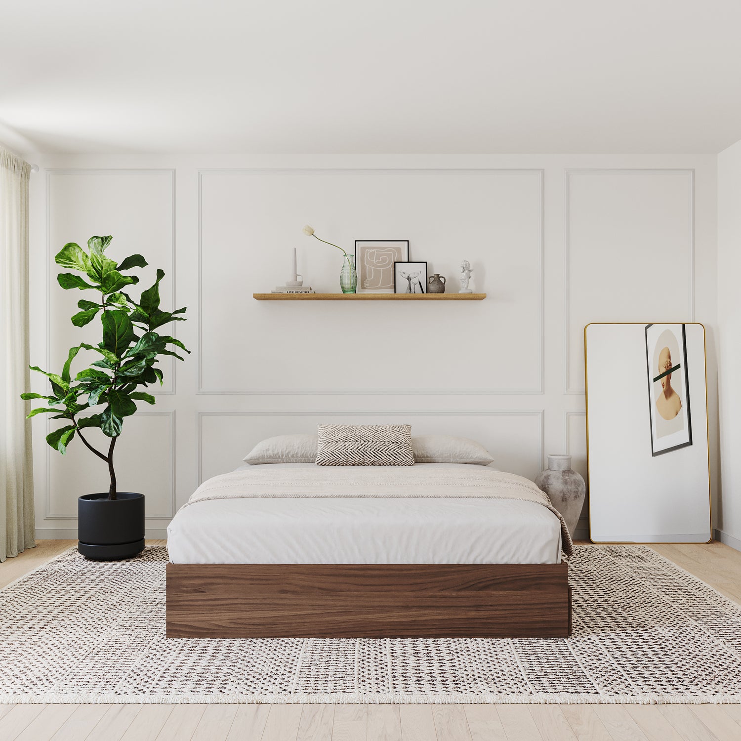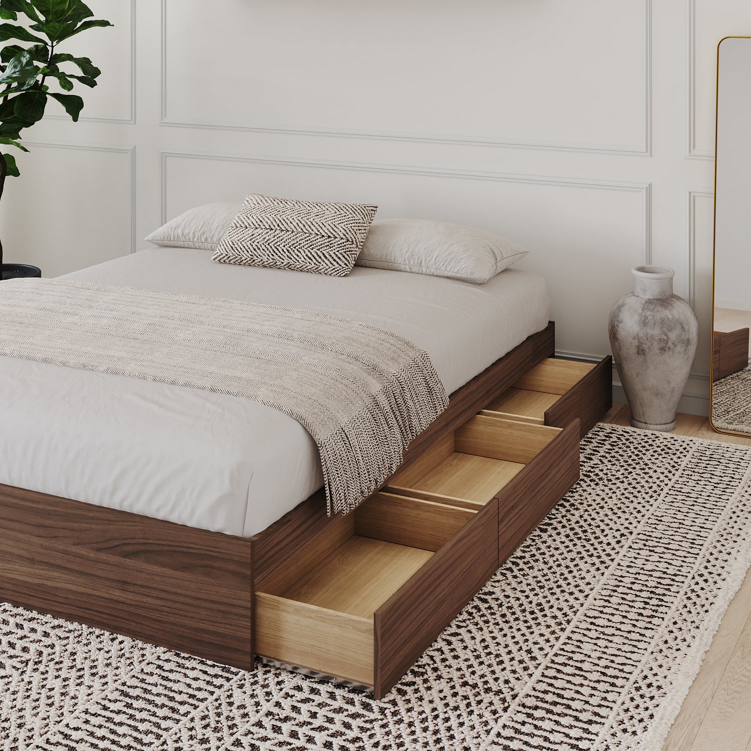 Nexera Queen size 3-drawer bed in Walnut can be paired with different Nexera Queen size headboards to create a complete bed set with lots of storage. This Queen Size 3-Drawer Storage bed offers 3 convenient drawers, ideal to store away beddings, clothes, toys, books without taking any extra square footage. It's also entirely reversible, so you can decide on which side of the bed you prefer having the 3 drawers. This bed frame features a unique metal and hardwood slat construction allowing for easy assembly, sturdy construction and easier handling.