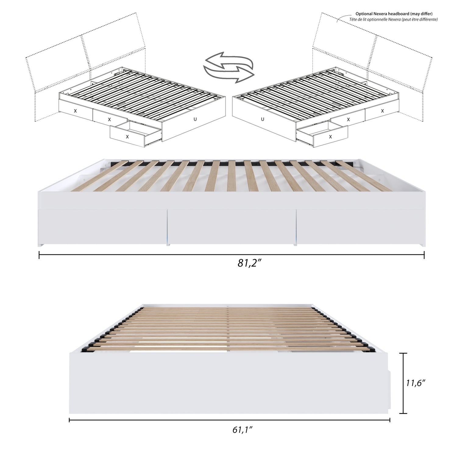 Nexera Queen size 3-drawer bed in White can be paired with different Nexera Queen size headboards to create a complete bed set with lots of storage. This Queen Size 3-Drawer Storage bed offers 3 convenient drawers, ideal to store away beddings, clothes, toys, books without taking any extra square footage. It's also entirely reversible, so you can decide on which side of the bed you prefer having the 3 drawers. This bed frame features a unique metal and hardwood slat construction allowing for easy assembly, sturdy construction and easier handling.