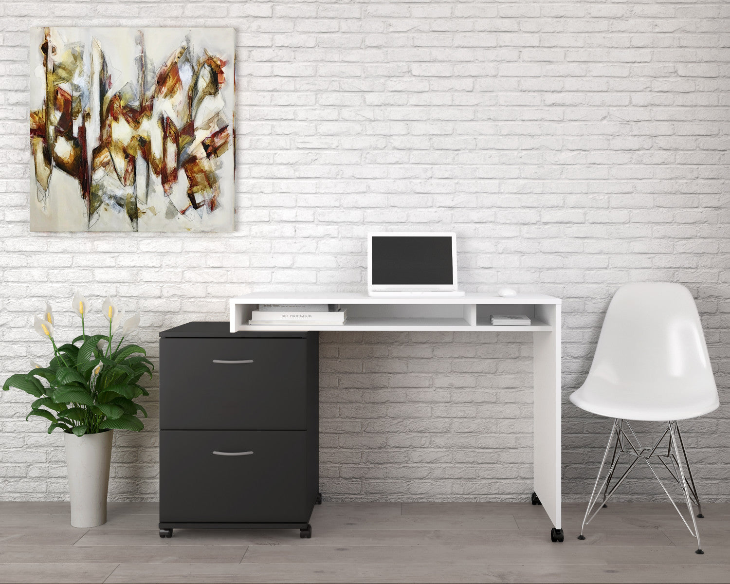 Essentials 2-Drawer Filing Cabinet features 2 filing drawers on metal slides. The filing drawers accommodate legal size files and the cabinet is mounted on casters for ease of use and mobility. Essentials Collection features a variety of mobile filing cabinets offered in multiple different finishes to best complement your home office space and add convenient storage.