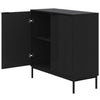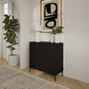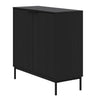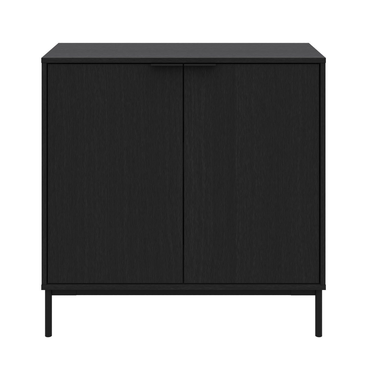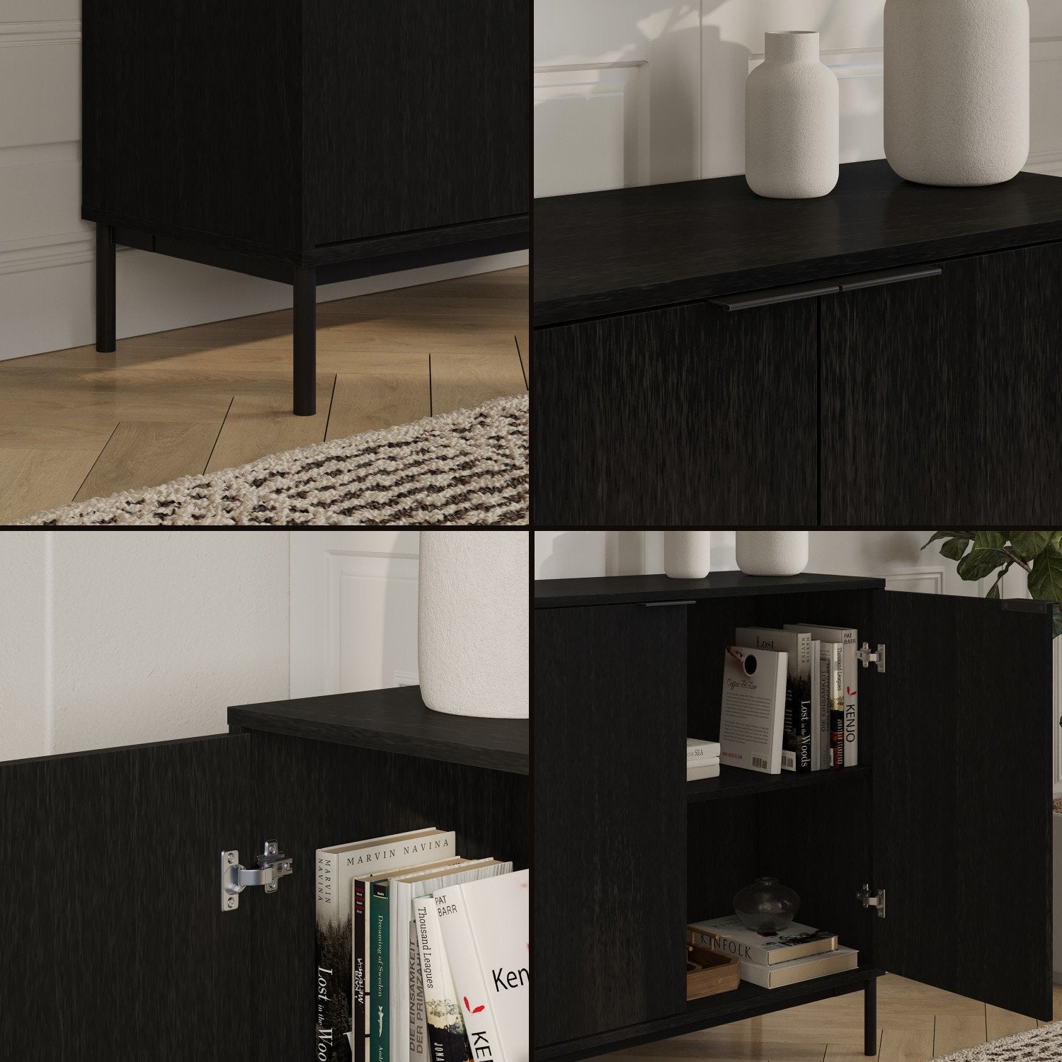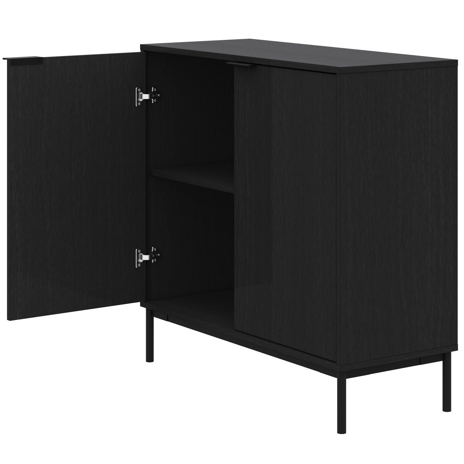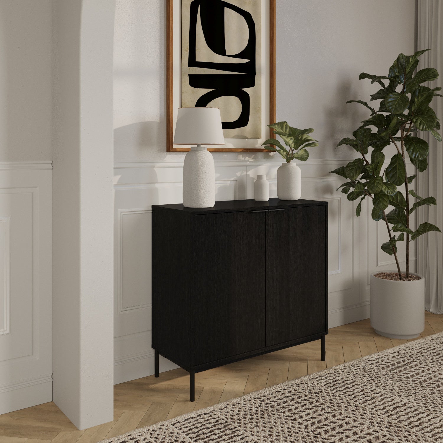 Clean, understated, and effortlessly stylish, the Slim Storage Cabinet in matte black woodgrain finish brings modern elegance to any space. Its generous storage and slender silhouette make it a versatile addition to the dining area, hallway or living room. The textured matte black finish adds depth and character, while the soft-close double doors conceal two spacious shelves—perfect for organizing everything from decor to home essentials. Slim black metal legs lift the cabinet for a light and contemporary feel.