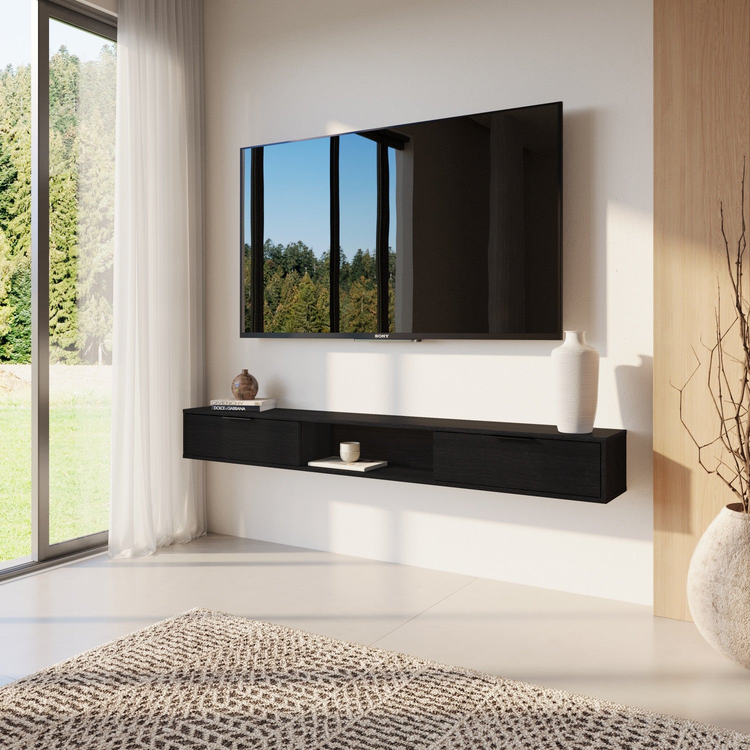 Designed to bring simplicity and structure to modern interiors, this floating wall console features a clean, architectural silhouette. The open center shelf offers space for display or media components, while the closed compartments on each side keep clutter neatly out of sight. Mounted above the floor, it creates an airy, streamlined look that opens up any room. Ideal in living rooms, entryways or home offices, it balances form and function with quiet elegance.