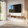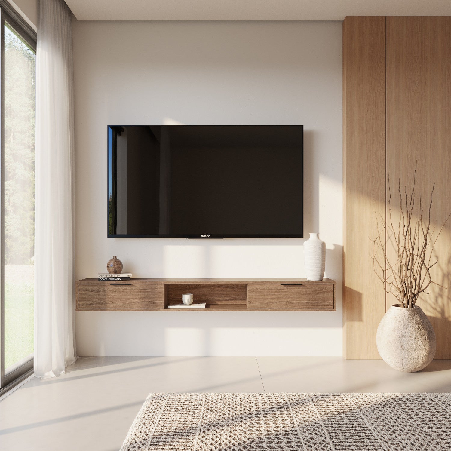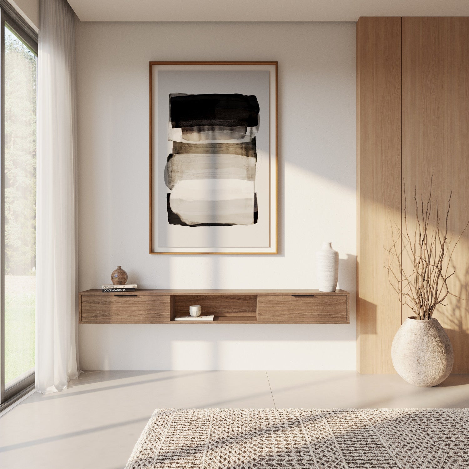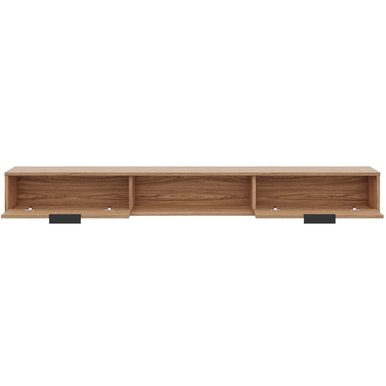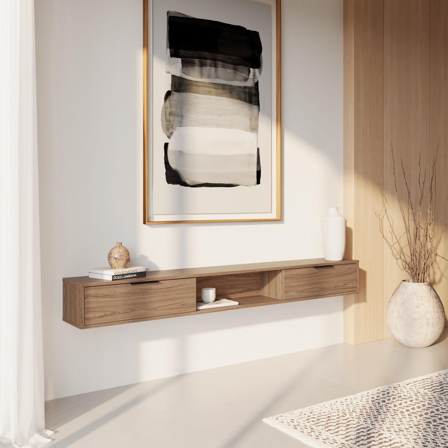 Designed to bring simplicity and structure to modern interiors, this floating wall console features a clean, architectural silhouette. The open center shelf offers space for display or media components, while the closed compartments on each side keep clutter neatly out of sight. Mounted above the floor, it creates an airy, streamlined look that opens up any room. Ideal in living rooms, entryways or home offices, it balances form and function with quiet elegance.