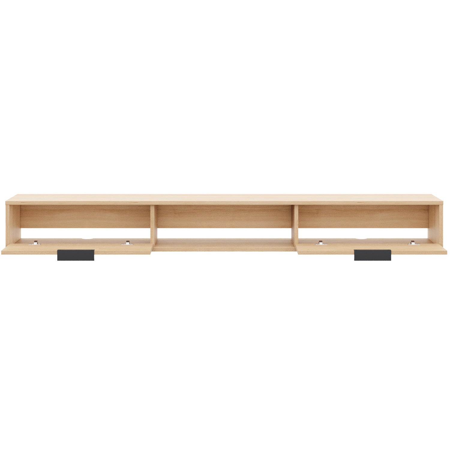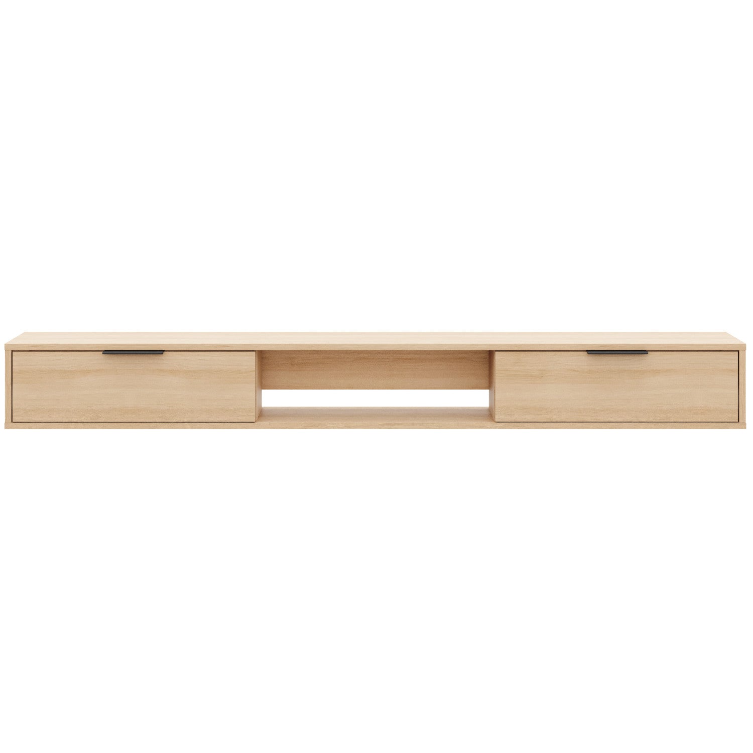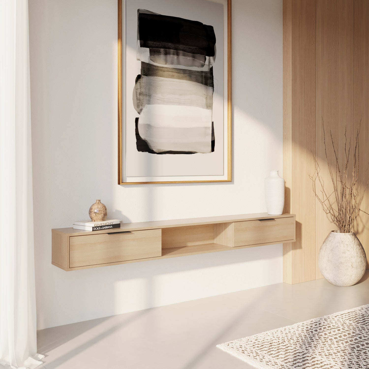 Designed to bring simplicity and structure to modern interiors, this floating wall console features a clean, architectural silhouette. The open center shelf offers space for display or media components, while the closed compartments on each side keep clutter neatly out of sight. Mounted above the floor, it creates an airy, streamlined look that opens up any room. Ideal in living rooms, entryways or home offices, it balances form and function with quiet elegance.