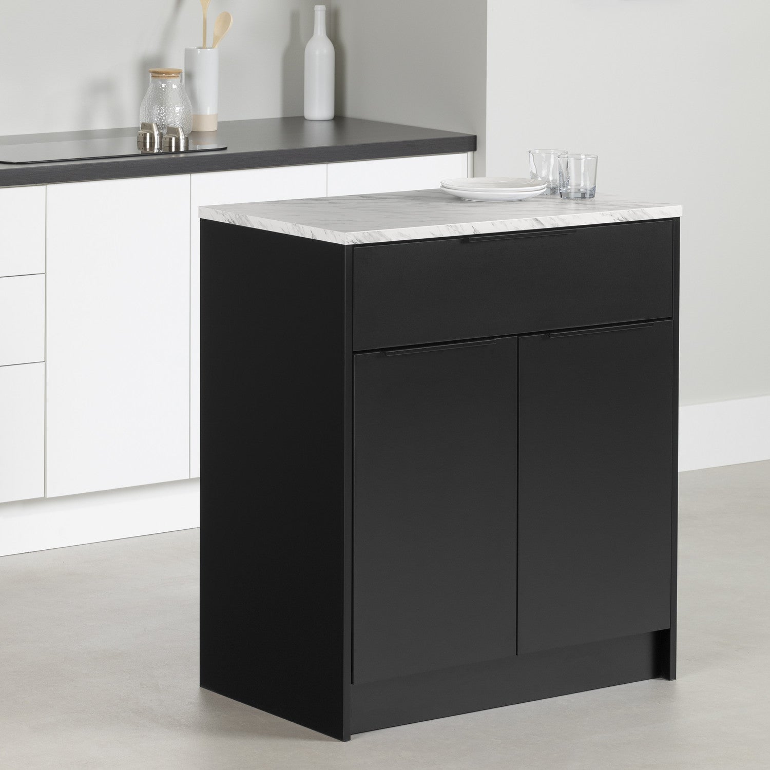 Just because you live in an apartment or modest-sized house doesn't mean you have to settle for a poorly laid-out kitchen! Because you deserve an ergonomic and practical environment in which to cook, we've created this surprisingly functional compact kitchen island. Equipped with contemporary metal handles, it blends in well with any decor and provides you with an extra work surface. On the water and scratch resistant melamine surface, dress your food, prepare comfort meals or enjoy your breakfast. The possibilities are endless! Personalize your home without major renovation by placing this kitchen island in the center of the room or against a wall. Every inch of this kitchen island has been designed to maximize space. The wide top drawer is the perfect size for your utensils and other cooking accessories. It features full-extension metal runners and a soft close system. This clever addition, also found on both cabinets, ensures smooth use. Behind the doors, a removable shelf has been installed to help you organize your kitchen essentials. The other side of the kitchen island features two false doors, giving your space a seamless finish.