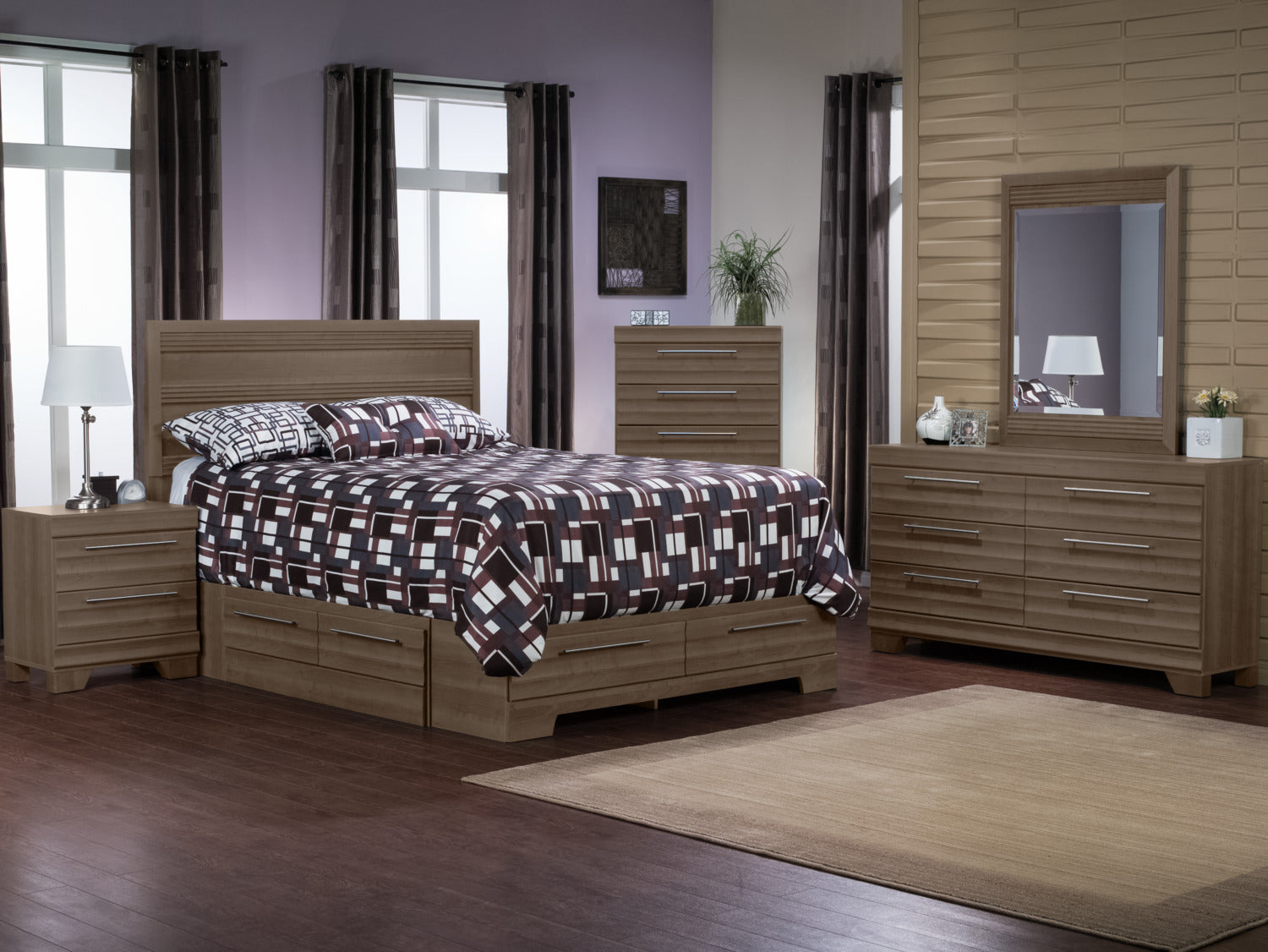 - Package includes one full-size storage bed (headboard, storage footboard and drawers), dresser and two nightstands.