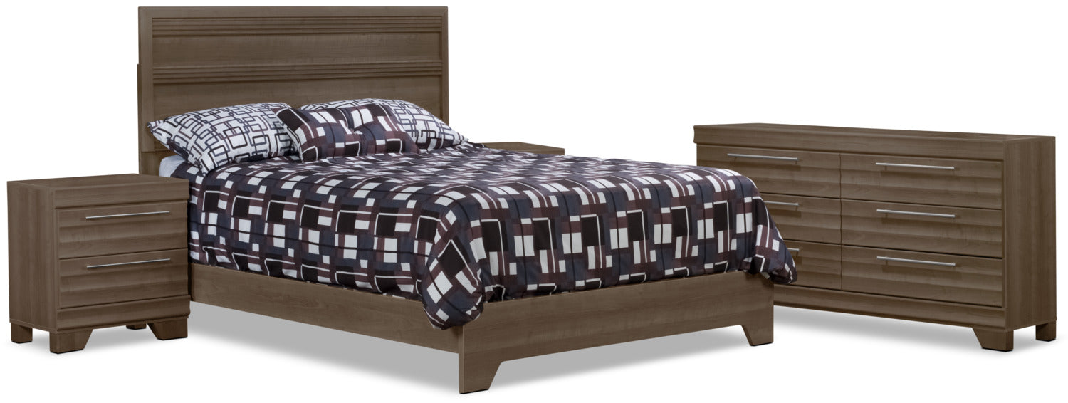 - Package includes one queen bed (headboard, footboard and rails), dresser and two nightstands.