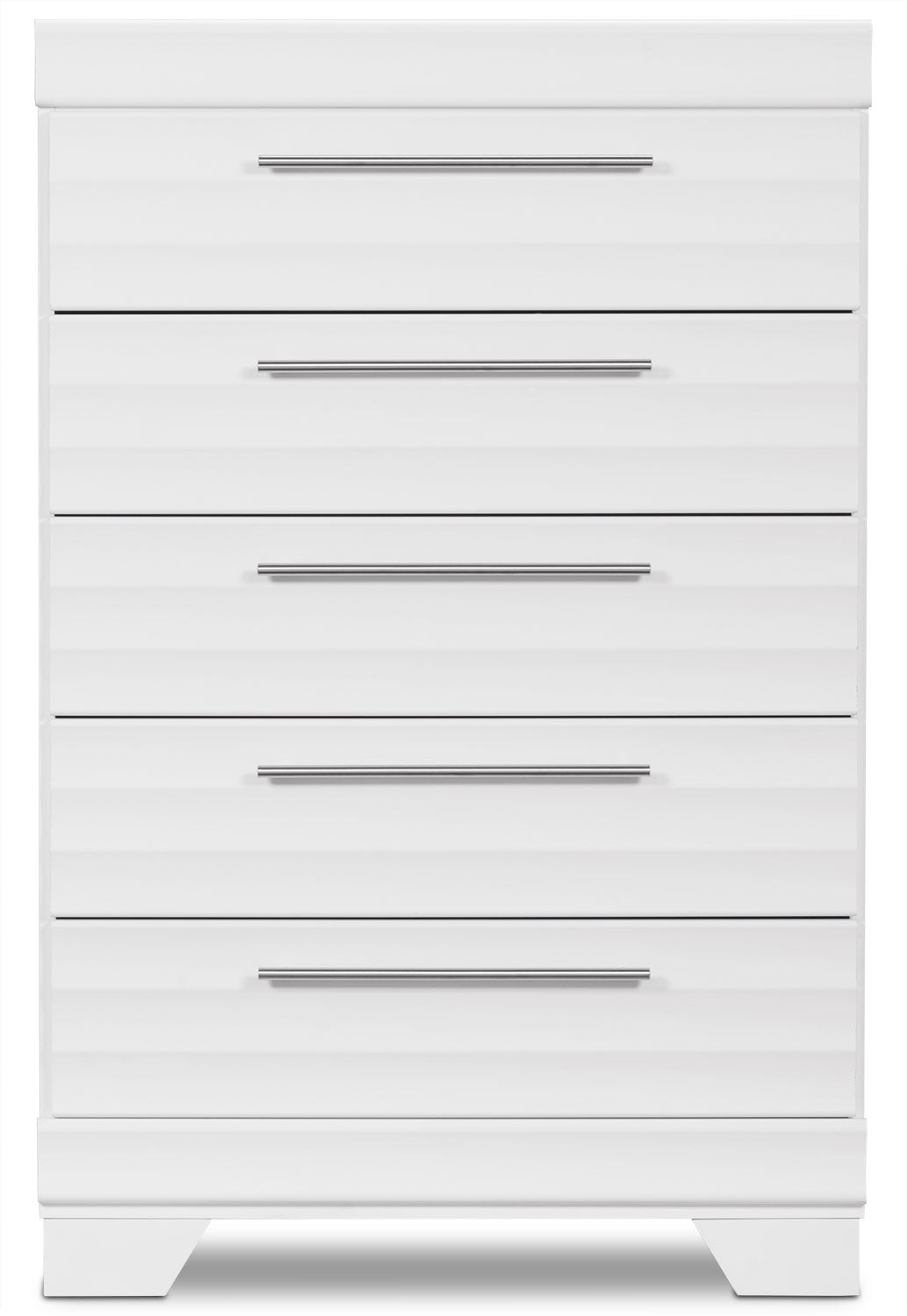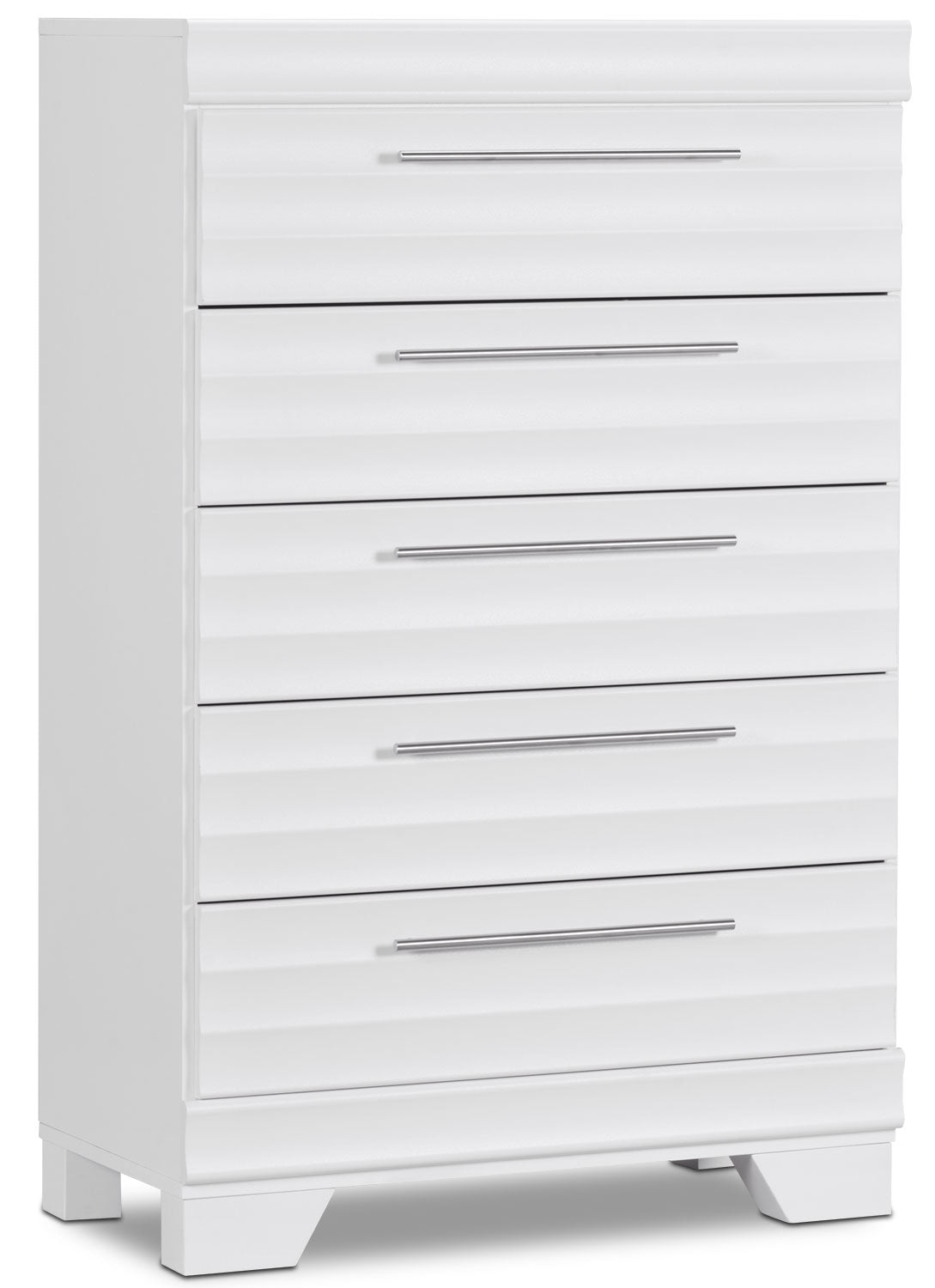 Add a splash of contemporary flair to your home with this Olivia chest. Understated details include carefully scalloped hollows and sleek pewter handles, which adds elegance to your bedroom. High-quality engineered wood is finished with laminated wood grain for a sleek look. With a striking design, this Olivia bedroom piece will make every day a bright, enjoyable experience.