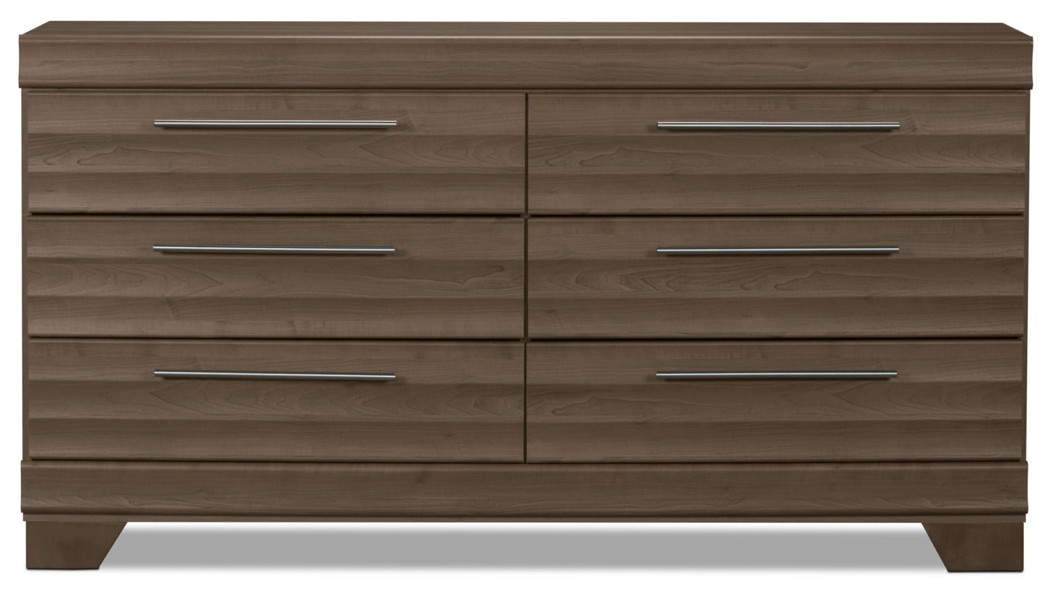 Add a splash of contemporary flair and a burst of fresh style to your home with this Olivia dresser. Understated details including carefully scalloped hollows and sleek pewter handles bring modern sophistication to your space, complementing affordability with elegance. Rest at ease knowing this Olivia piece will bring you long-lasting glamour thanks to high-quality engineered wood finished with laminated wood grain.