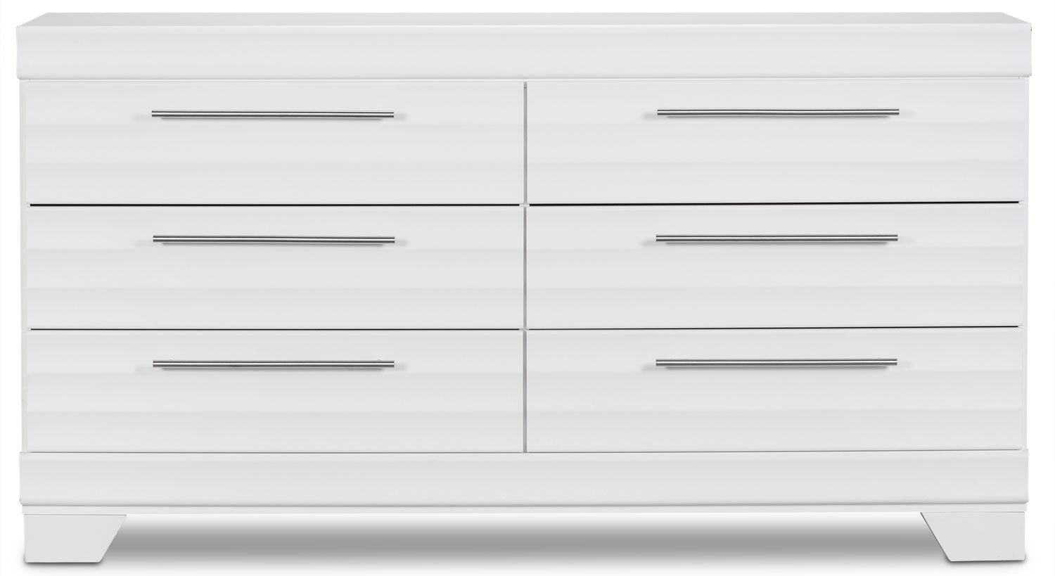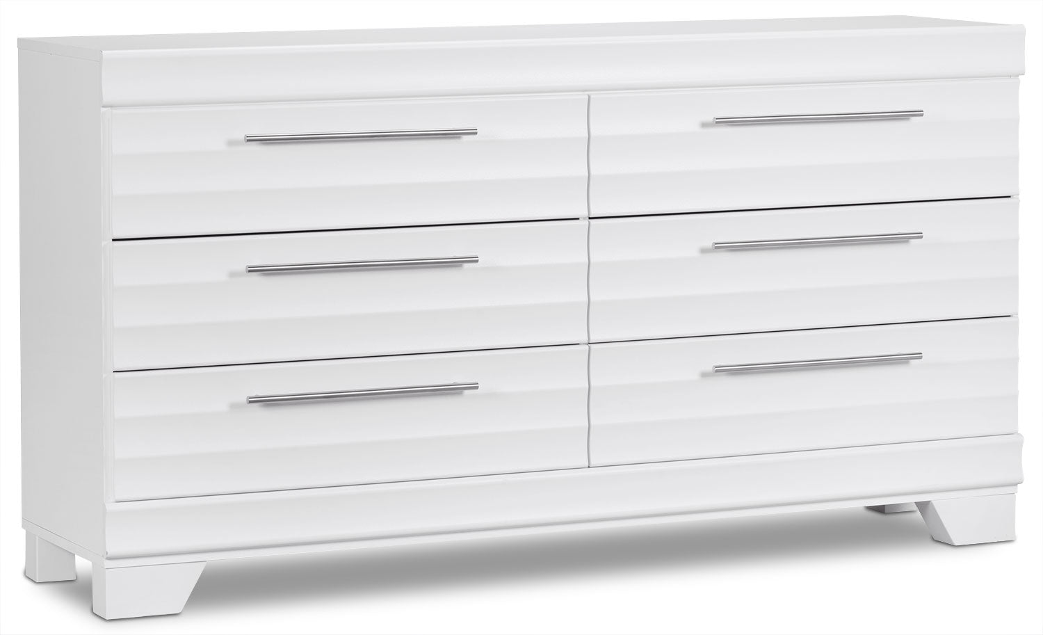 Add a splash of contemporary flair to your home with this Olivia dresser. Understated details include carefully scalloped hollows and sleek pewter handles, which adds elegance to your bedroom. High-quality engineered wood is finished with laminated wood grain for a sleek look. With a striking design, this Olivia bedroom piece will make every day a bright, enjoyable experience.