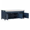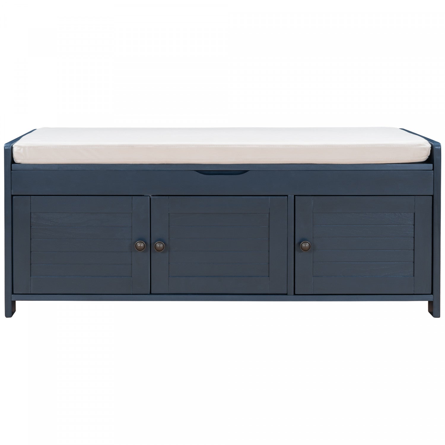 The storage bench blends rustic charm with modern functionality, offering seating, storage, and hidden space in one versatile piece. Featuring three shutter-style doors and elegant metal handles, this bench adds character to any entryway or bedroom. It offers two interior cabinets for organizing shoes and daily essentials, plus a lift-up top with hidden storage for private items. Made from mdf and pine wood, it’s sturdy enough to seat two adults comfortably. A removable cushion provides added comfort, and side handles make moving it easy.