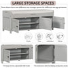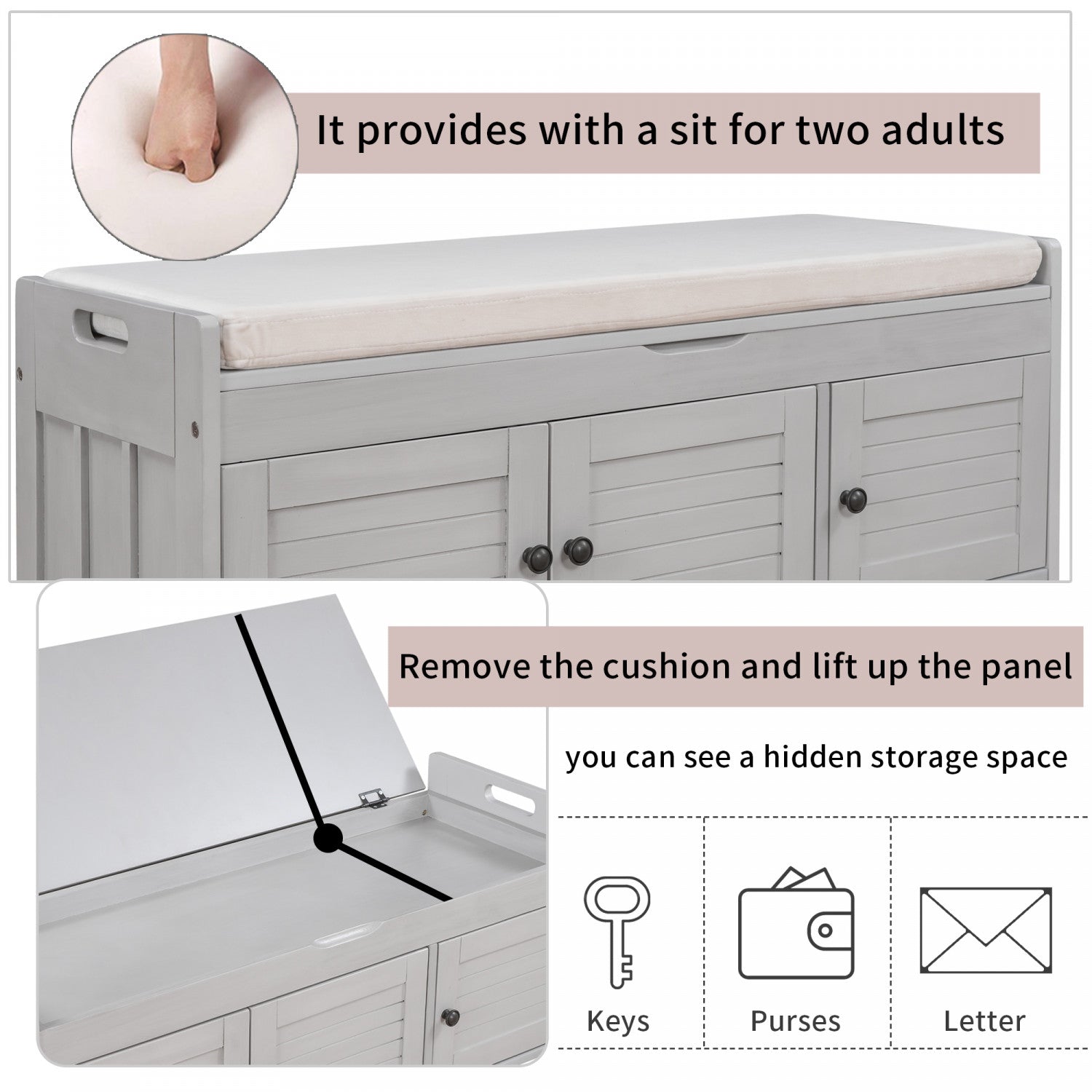 The storage bench blends rustic charm with modern functionality, offering seating, storage, and hidden space in one versatile piece. Featuring three shutter-style doors and elegant metal handles, this bench adds character to any entryway or bedroom. It offers two interior cabinets for organizing shoes and daily essentials, plus a lift-up top with hidden storage for private items. Made from mdf and pine wood, it’s sturdy enough to seat two adults comfortably. A removable cushion provides added comfort, and side handles make moving it easy.