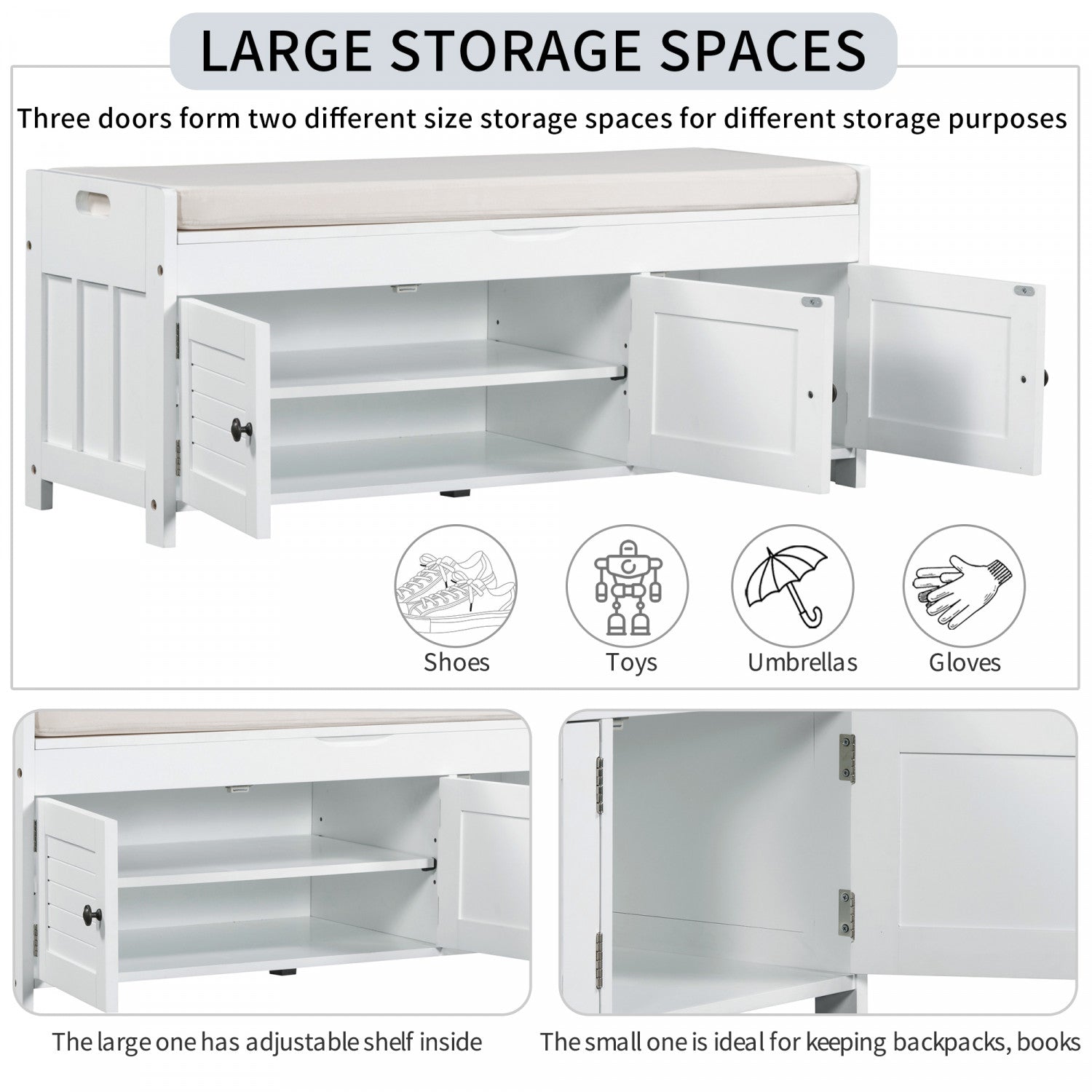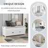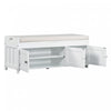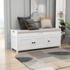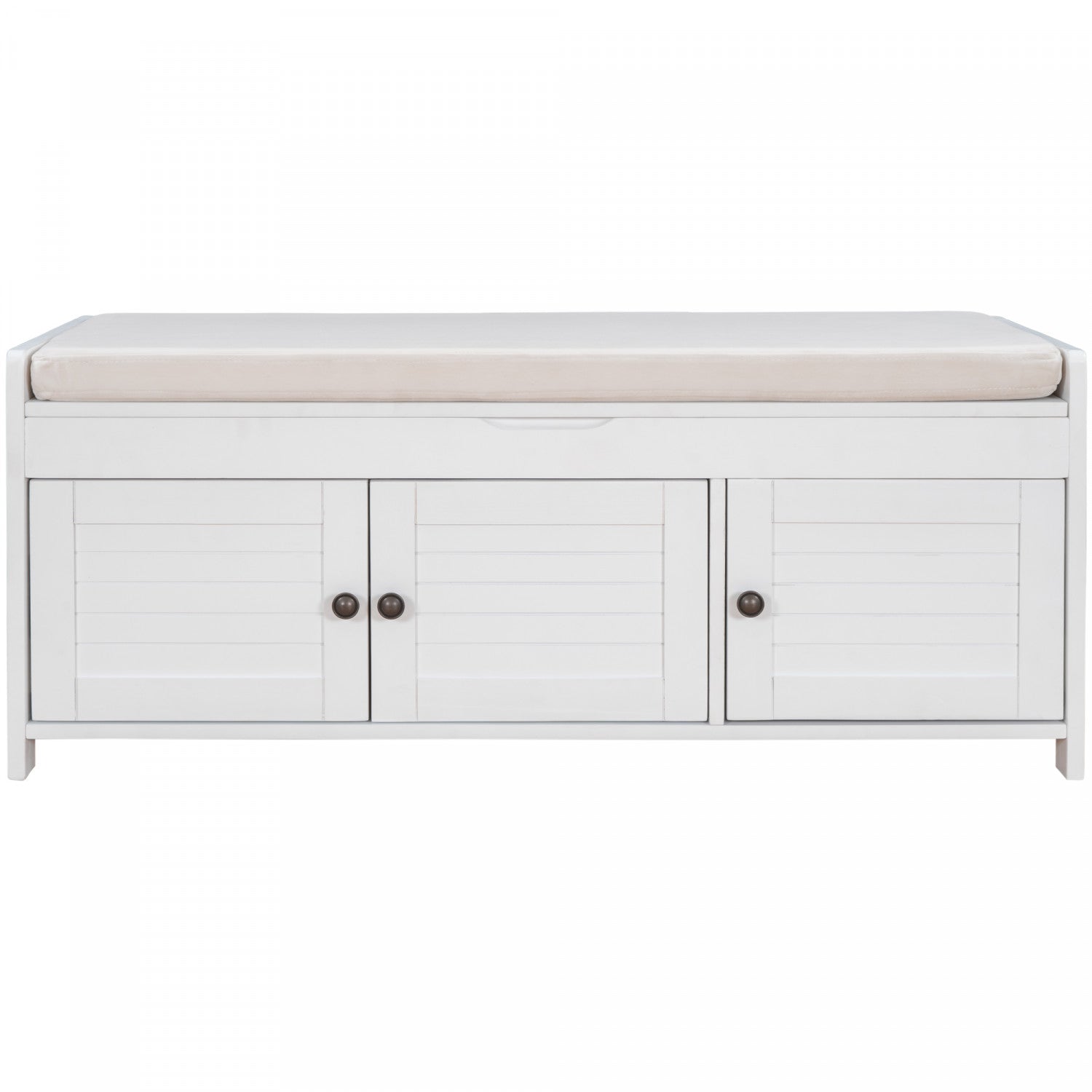 The storage bench blends rustic charm with modern functionality, offering seating, storage, and hidden space in one versatile piece. Featuring three shutter-style doors and elegant metal handles, this bench adds character to any entryway or bedroom. It offers two interior cabinets for organizing shoes and daily essentials, plus a lift-up top with hidden storage for private items. Made from mdf and pine wood, it’s sturdy enough to seat two adults comfortably. A removable cushion provides added comfort, and side handles make moving it easy.