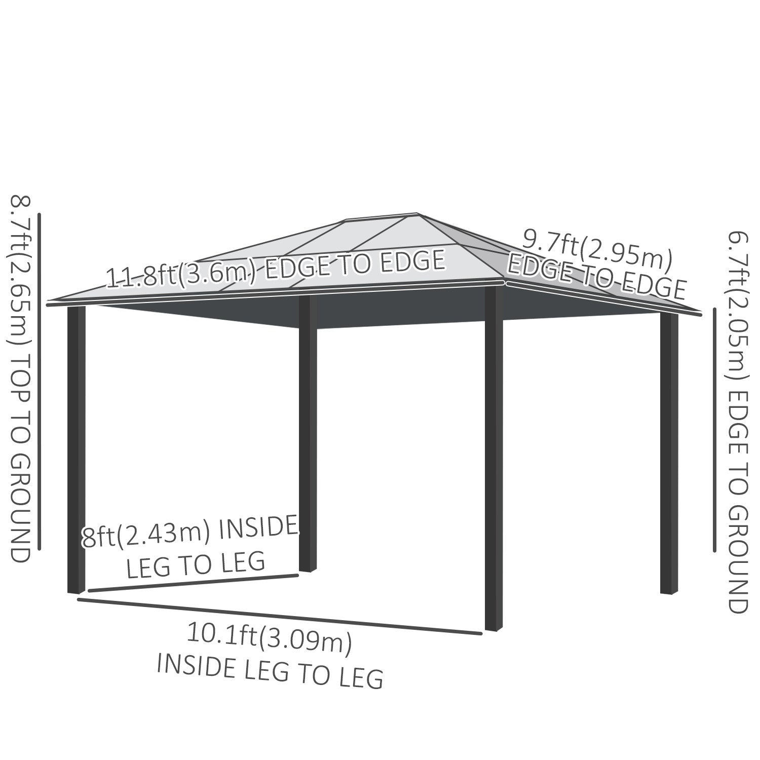 | Key Features | ● Hardtop gazebo provides 107 sq.FT of outdoor living area ● Sturdy aluminum frame gives gazebo excellent support ● Heavy duty thick polycarbonate sheet roof features with water proof and UV treated ● Curtains and sling netting mesh keep the bugs out and comfort in ● Includes 8 anchors that keep the gazebo stable to the ground ● Stylish vented roof dissipate summer heat and allow sunlight through ● Mesh and curtain with zipped design for easy walk-in and out ● Big Velcro fasteners on each steel post for easy fixation of the curtains ● Assembly required with all necessary hardware included |