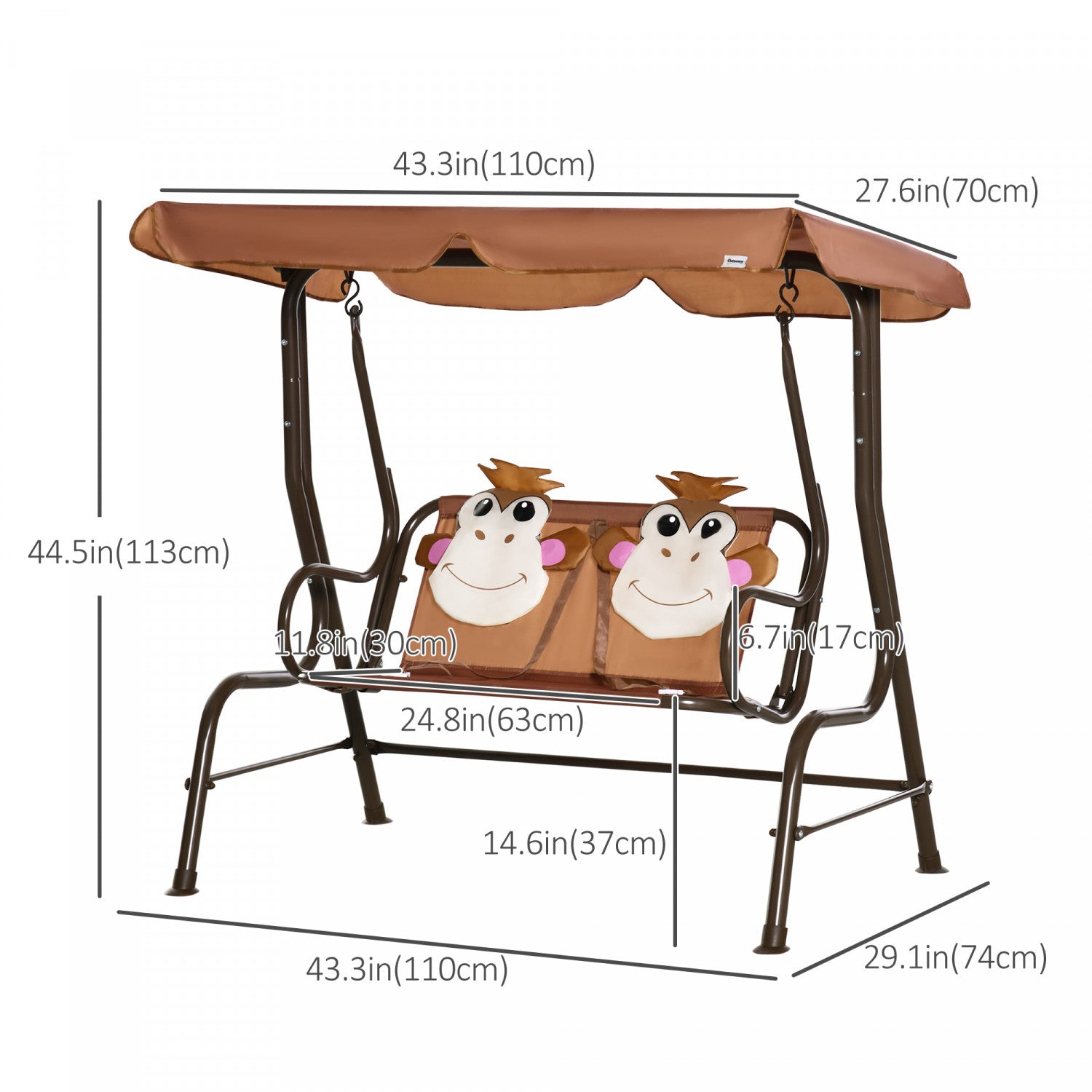 | Key Features | ● Solid metal frame and non-slip feet ensure stability and keep itself stable ● The sitting height is designed for children, offering them so much comfort ● The monkey pattern on the surface makes the double seat swing chair full of summer atmosphere, making children like it more ● Angle adjustable top canopy protects your kids from getting sunburned ● Double-seat design gathers their friends to play ● 2 Seat belts ensure safety for your kids ● Suitable for any outdoor or indoor place and will be a great addition ● Assembly required |