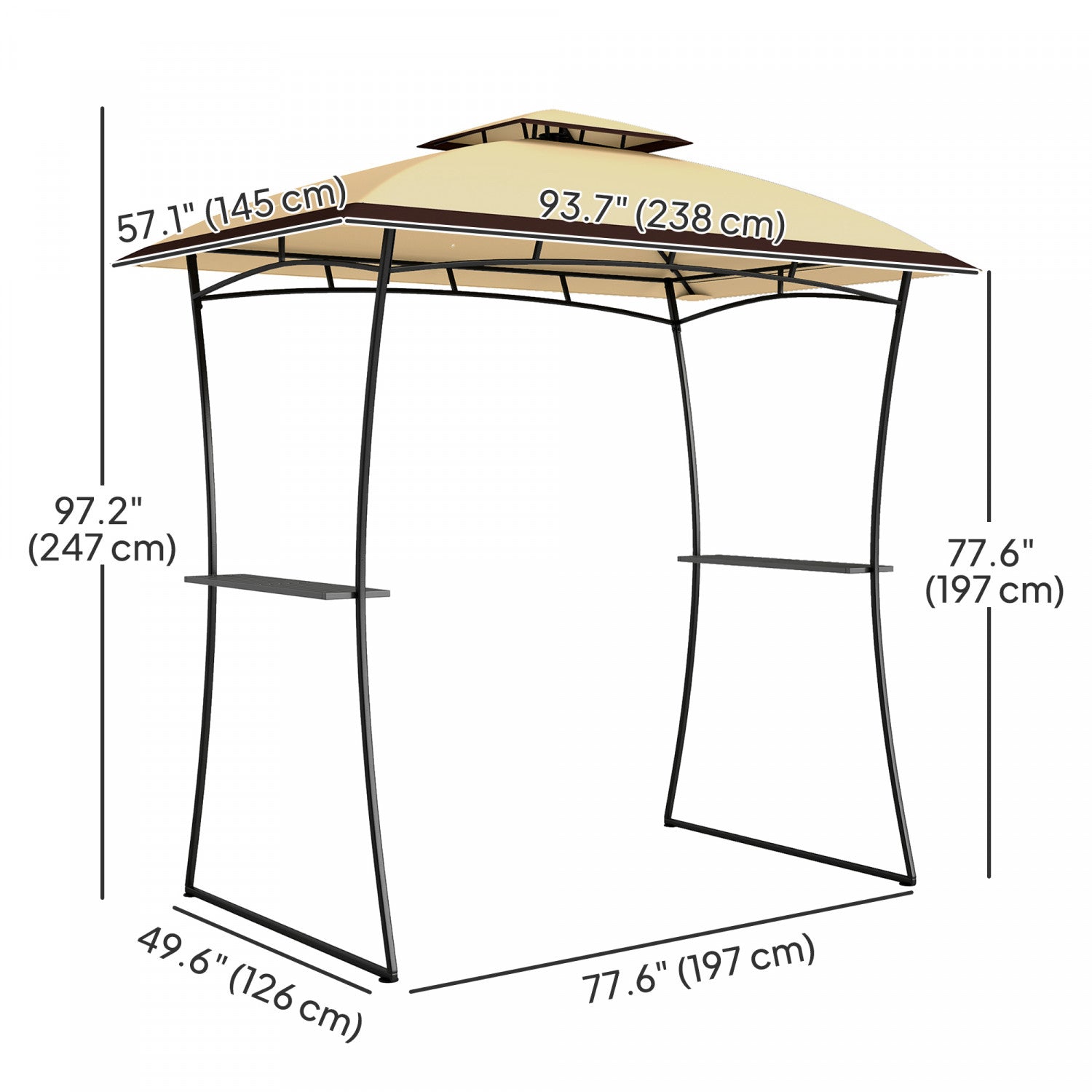 | Additional Information | - Colour: Beige; - Materials: Galvanised Metal, Polyester; - Overall Dimension: 93.7" L x 57.1" W x 97.2" H (238 x 145 x 247 cm); - Eave Height: 77.6" H (197 cm); - Column Spacing: 76.8" L x 34.6"-49.6" W (195 x 88-126 cm); - Shelf Size: 34.6" L x 7.9" W (88 x 20 cm); - Shelf Height to Floor: 39.8" (101 cm); - Windproof Level: 4-5 (6.6-12.9 mph (10.6-20.8 km/h)) - Snow Load Capacity: 11 lbs.-22 lbs. (5-10 kg); - Weight Capacity: 88 lbs. (40 kg) (shelf), 11 lbs. (5 kg) (hook); - Item Label: 84C-551V00BG; |