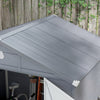 | Additional Information | - Colour: Dark Grey; - Material: PP, Aluminum; - Overall Dimensions: 94.5" W x 74.8" D x 89.8" H (240 x 190 x 228 cm); - Eave Height: 70.9" (180 cm); - Bottom Size: 89.8" W x 70.9" D (228 x 180 cm)/4.1 m² (44 ft²); - Inner Area: 88.6" W x 68.9" D (225 x 175 cm) - Door Size: 29.1" W x 70.9" H (74 x 180 cm); - Vent Size: 8.3" W x 4.3" H (21 x 11 cm); - Window Size: 13.8" W x 18.9" H (35 x 48 cm); - Snow Load Capacity: 4 lbs/ ft² (20 kg/㎡); - Item Label: 845-410V05CG; |