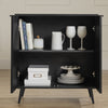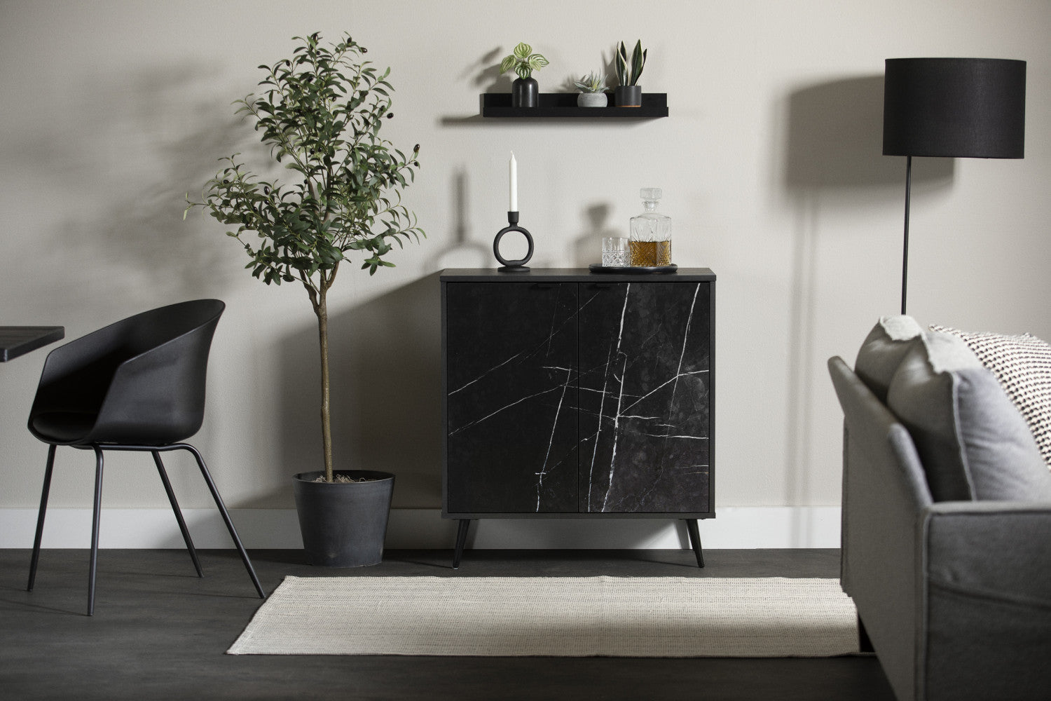 With its 2 doors leading to a spacious storage space, this cabinet includes an adjustable shelf that can support up to 25 lbs. This feature lets you neatly organize a wide range of items, from dining essentials to crafting supplies, and from games to books. It’s equipped with a water and scratch-resistant top, allowing you to place your dishes, tea sets, or beverages without any worries. Plus, the soft-close hinges ensure the doors to shut quietly and smoothly. Its clean design, accentuated by a dynamic pattern on the front doors, creates a visual effect that stands out for its originality. The metal legs and handles reinforce its contemporary look, while the finished back offers the freedom to plate it anywhere – be it in the dining room or as an additional piece in the living room for books and decorative items.