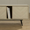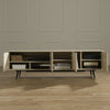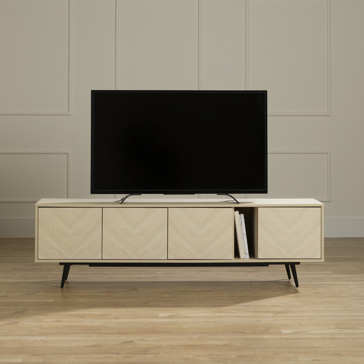 This TV stand is the contemporary touch that transforms the living room. Its slim metal legs and 71-inch length bring a sense of lightness and modernity. The handle-free design, achieved through a touch-to-open mechanism, creates an ever smoother and more refined appearance. The finishing touch, geometric patterns on the façade, gives it that extra something that catches everyone’s eye. Designed to make your life easier, this piece says goodbye to tangled cables with a cable management hole accessible from two compartments. It also features adjustable shelves, ample closed space, and a vertical open compartment for everything that needs to be within easy reach. Supporting televisions up to 75" and with legs at only 2 ends, it's as sturdy as it is stylish.