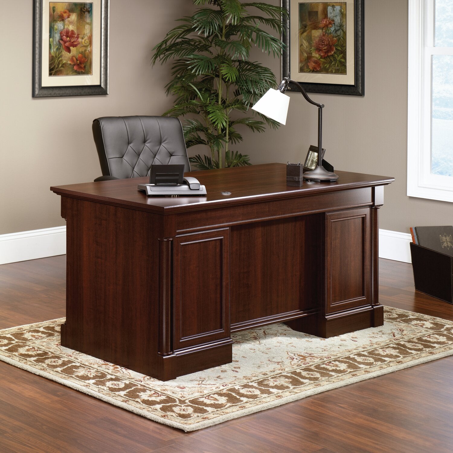 Elevate your office with this Palladia executive desk. Its classic double pedestal design offers a spacious top for your laptop and documents, while the flip-down panel keeps your keyboard neatly tucked away. A cord management system with two desktop grommets and numerous pass-throughs allow for a clutter-free space, ensuring a well-organized office. Plus, the rich cherry hue adds dramatic flair, complementing your already-existing décor. For those looking for a stunning desk that offers both function and style, look no further than the Palladia.