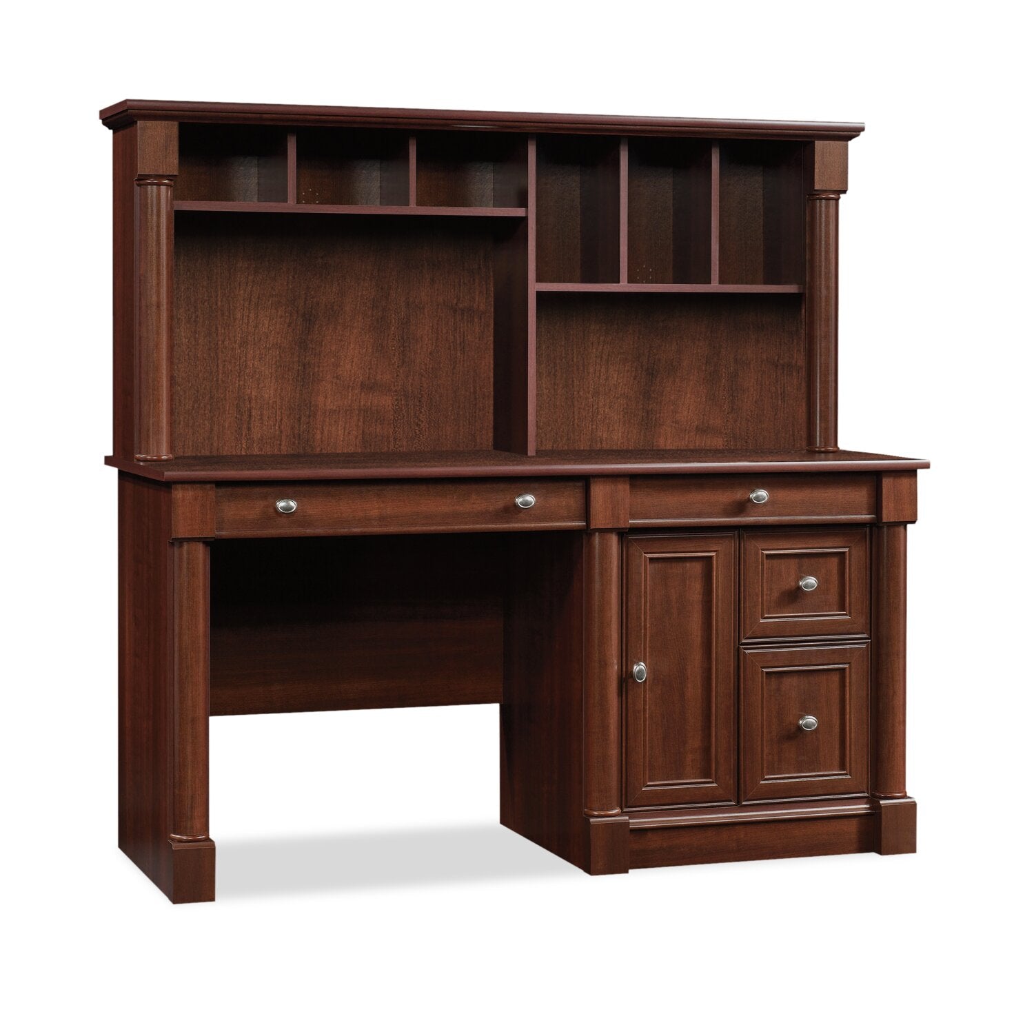 | Storage Options | Four drawers (one for letter-sized files and another with a flip-down panel to place a keyboard), one cabinet with adjustable shelf and cubby storage in the hutch. |
