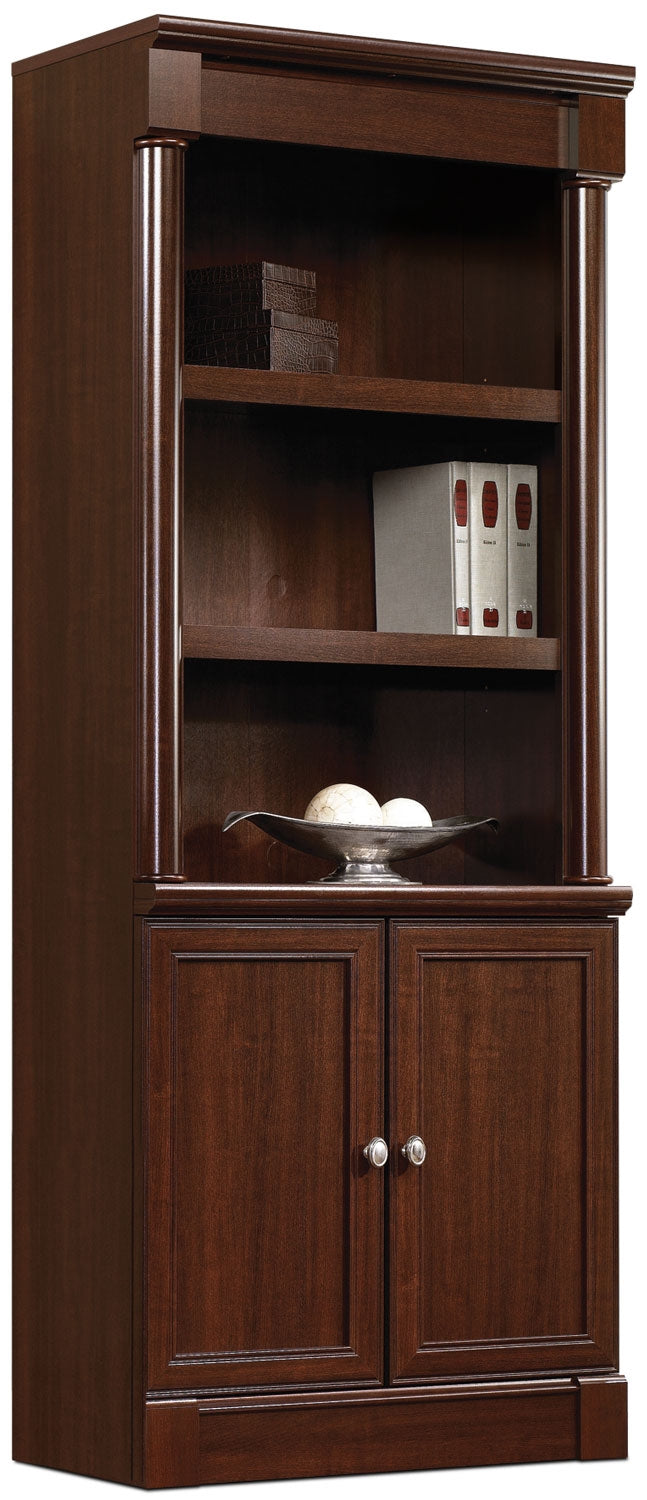 This striking Palladia library in a select cherry colour combines traditional style with modern functionality. Its three adjustable shelves allow for customizable storage of your books, Blu-ray discs and more. Furthermore, hidden storage conceals your special or valuable items behind the library’s doors. As an added benefit, the enclosed back panel has cord access, allowing you to enjoy your electronics without the trouble of unsightly wires.
