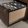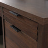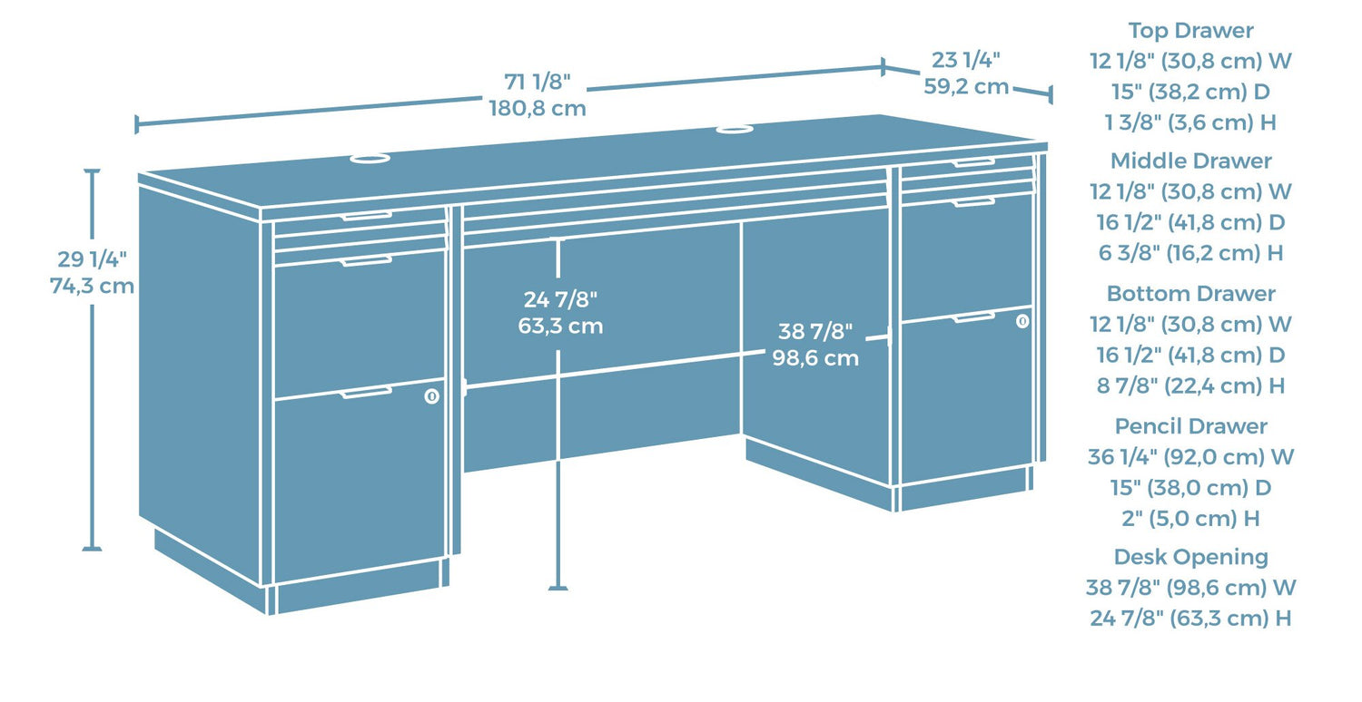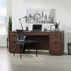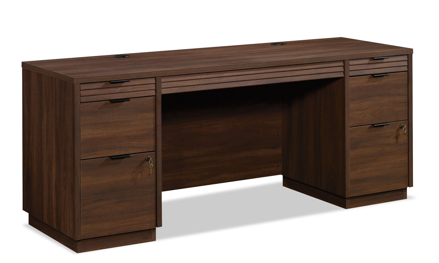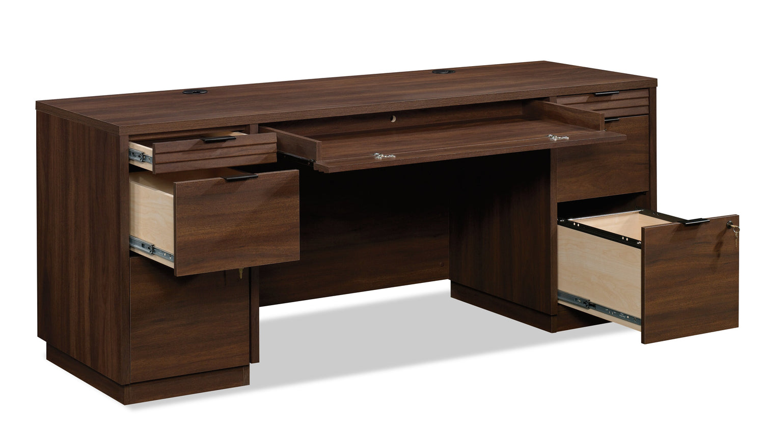 This Palo Alto credenza desk offers enough space for office essentials while acting as a filing cabinet or accent piece. A durable heat-, stain- and scratch-resistant top surface with impact-resistant, high-grade thermoplastic edges make this workspace perfect for placing home decor or your printer and laptop. Featuring a flip-down keyboard panel and six drawers, your office essentials will be organized and easy to reach. Plus, the two lower drawers hold letter- or legal-size hanging files. With a dark brown finish, this desk is a grand addition to your office space.