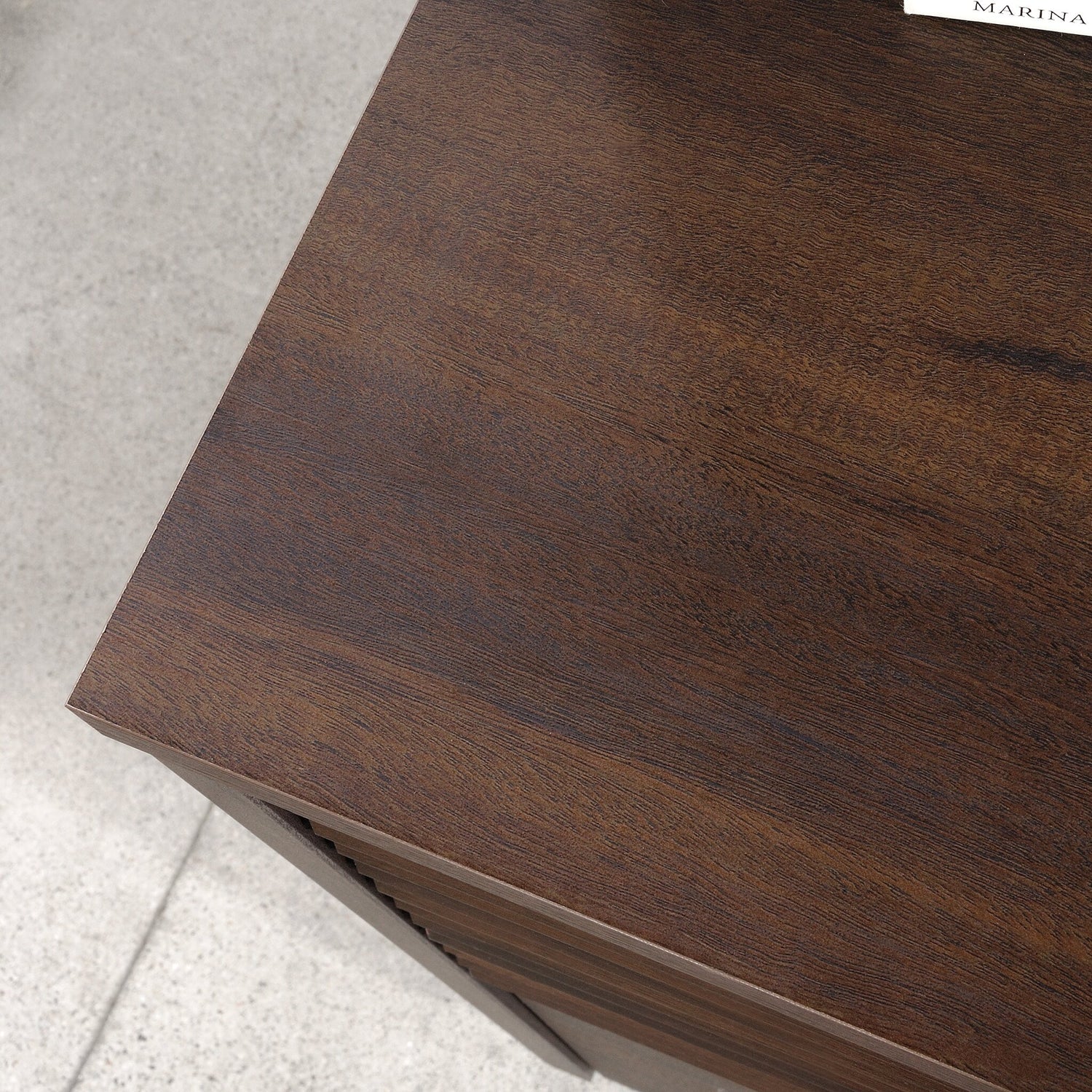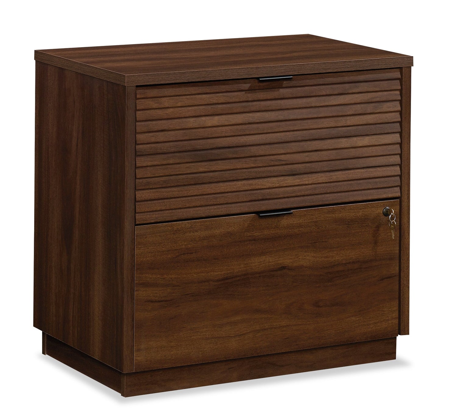 This Palo Alto filing cabinet has an ideal amount of storage space, with the bonus of being stylish, too. Catching the eye with vertical woodgrain and horizontal slatting, this piece has a heat-, stain- and scratch-resistant top, with impact-resistant, high-grade thermoplastic edges, to make sturdy room for a printer, lamp, books, plants and more. Two drawers hold letter or legal-size hanging files, with the addition of having an interlocking safety mechanism and a key lock. With a dark brown finish, this cabinet is a grand addition to your office space.